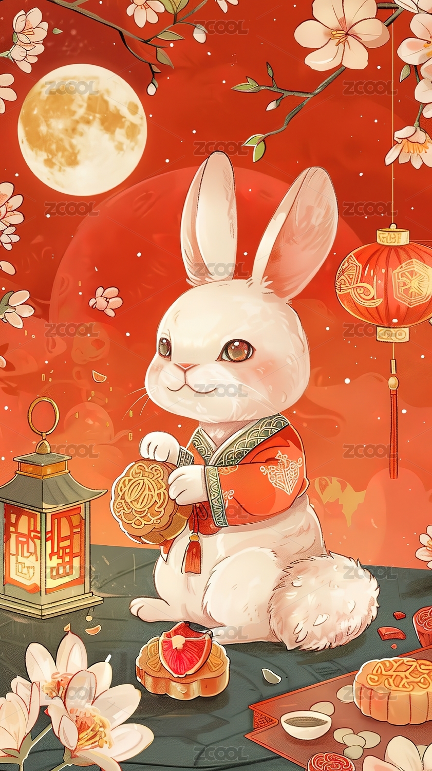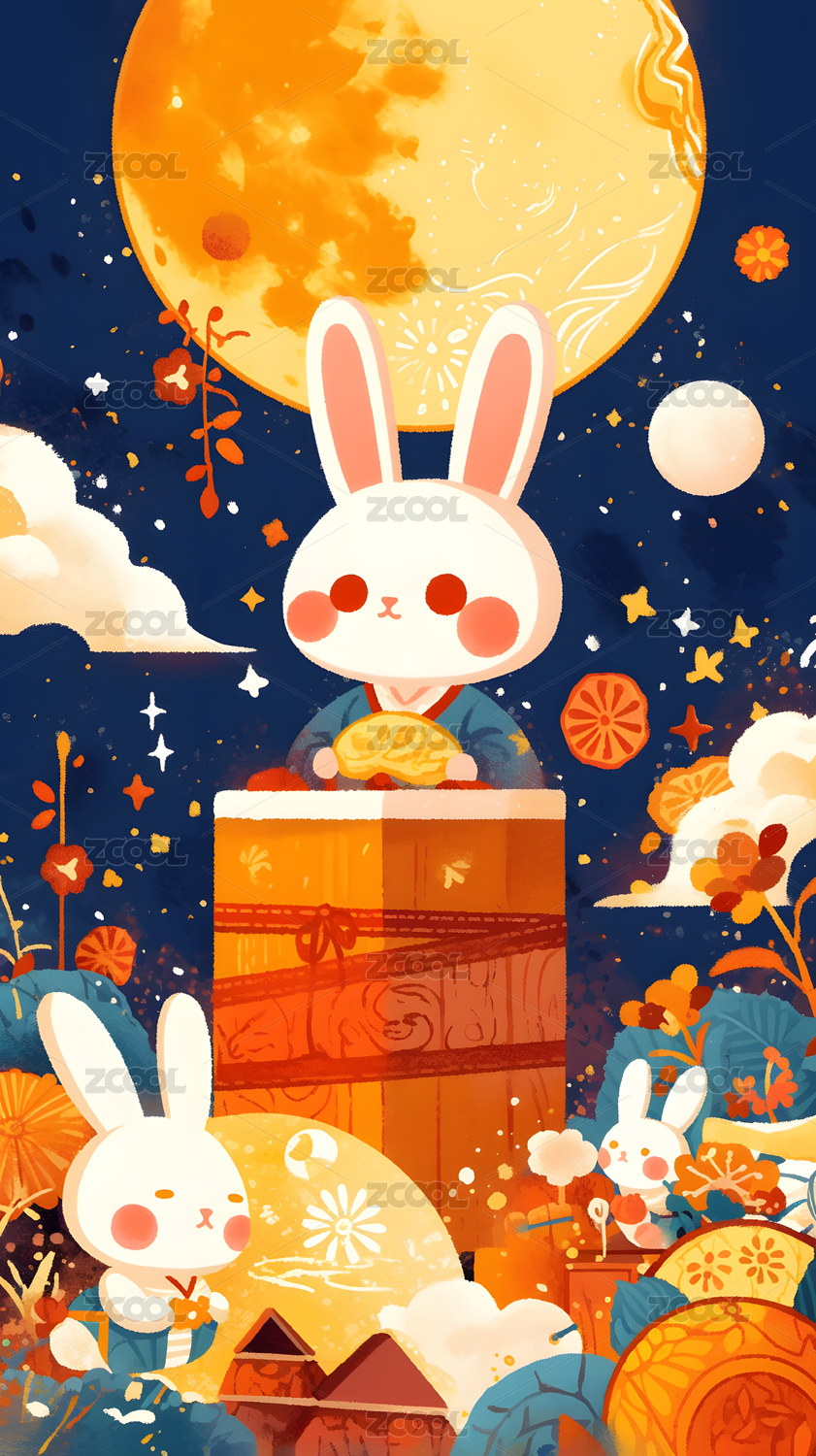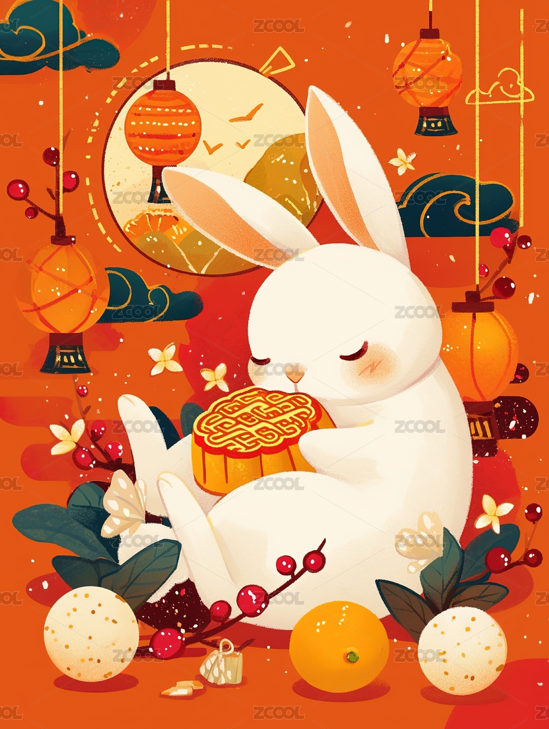中秋节满月背景下正在吃月饼的可爱玉兔