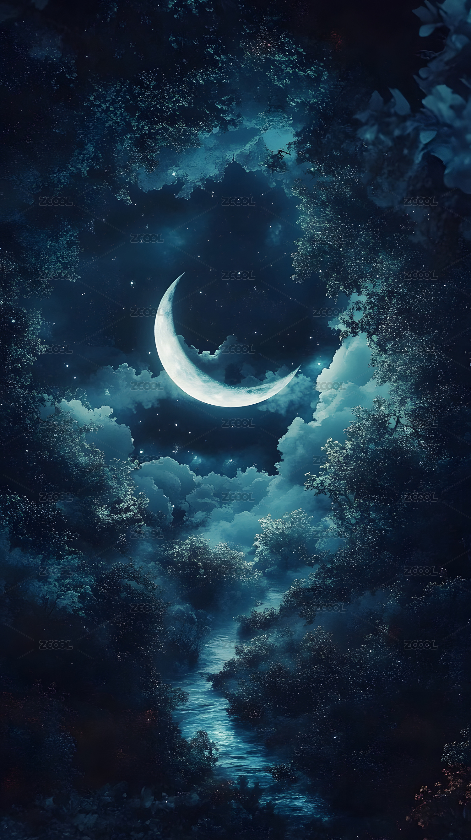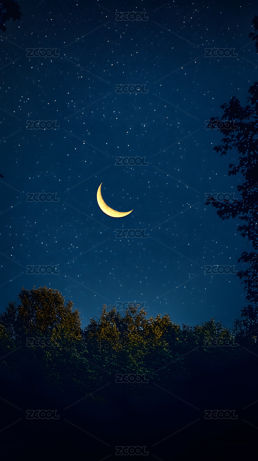 梦幻森林夜空弯月美景