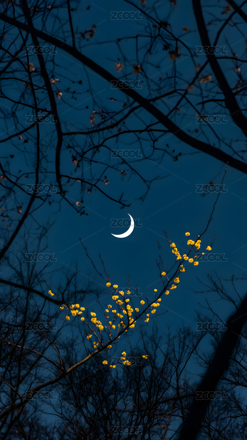 夜空弯月与枝头花朵