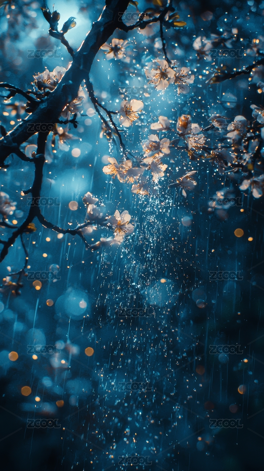 夜空中弯月与枝头繁花