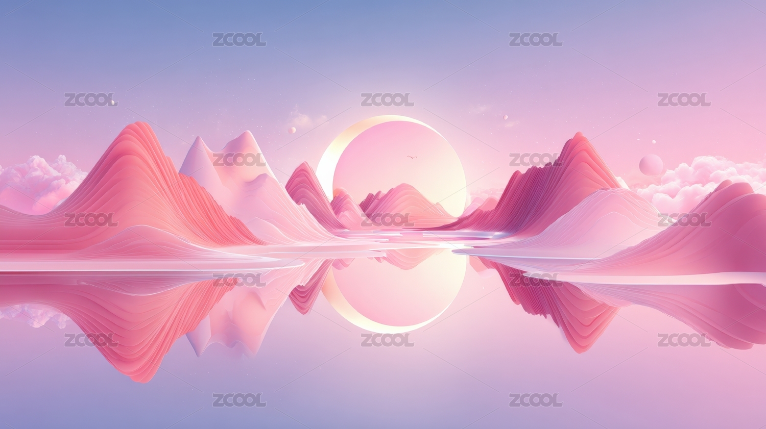 梦幻粉色山峦与静谧湖泊