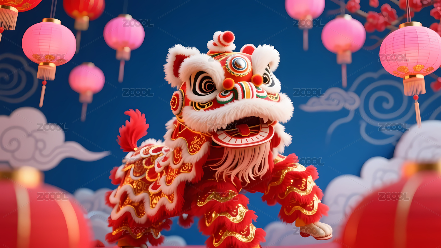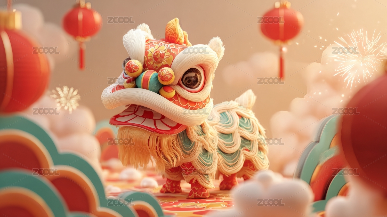 春节元宵过年庙会灯会上的舞狮与灯笼烟花