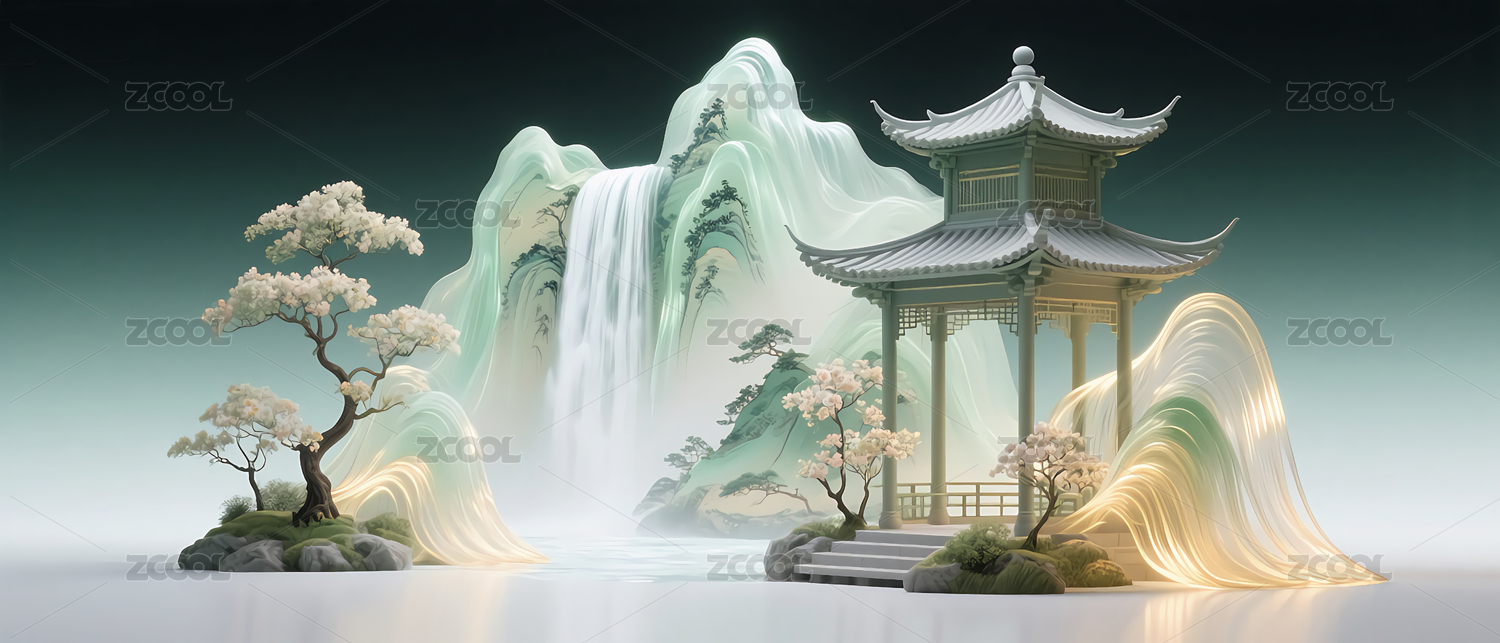 有亭台楼阁小桥流水的仙境绿色山水3D卡通