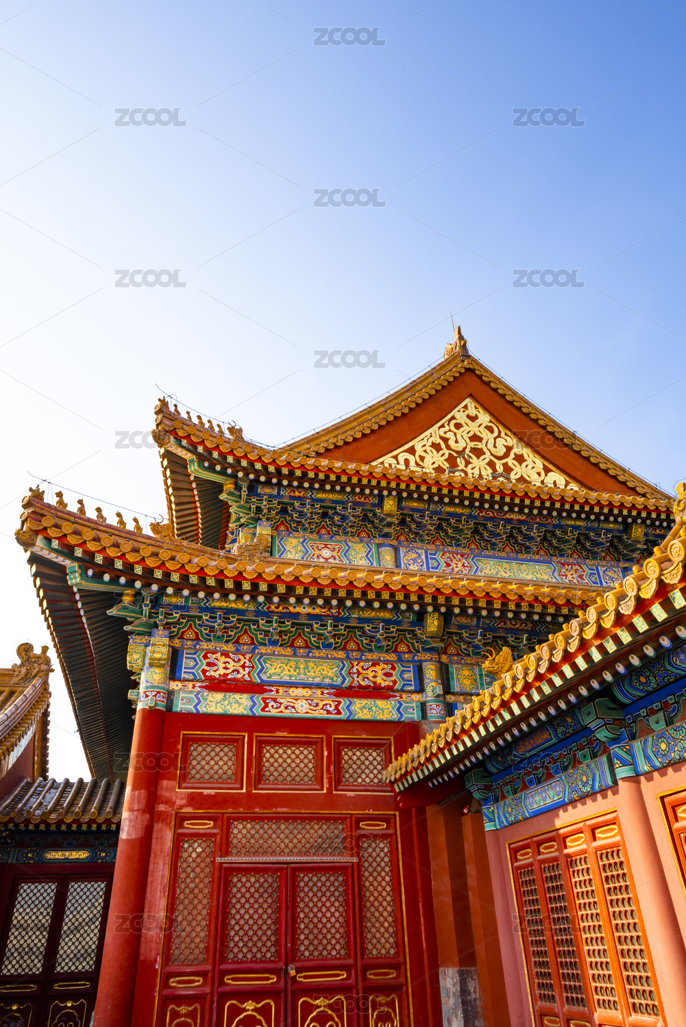 中国北京古建一角—琉璃瓦屋顶飞檐斗拱彩绘描金万字纹龙纹