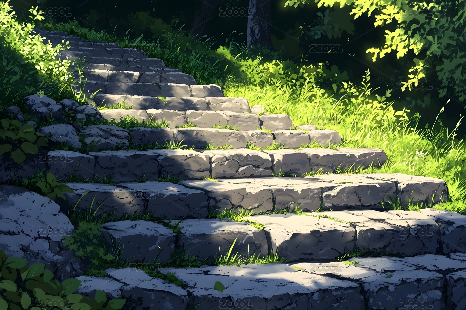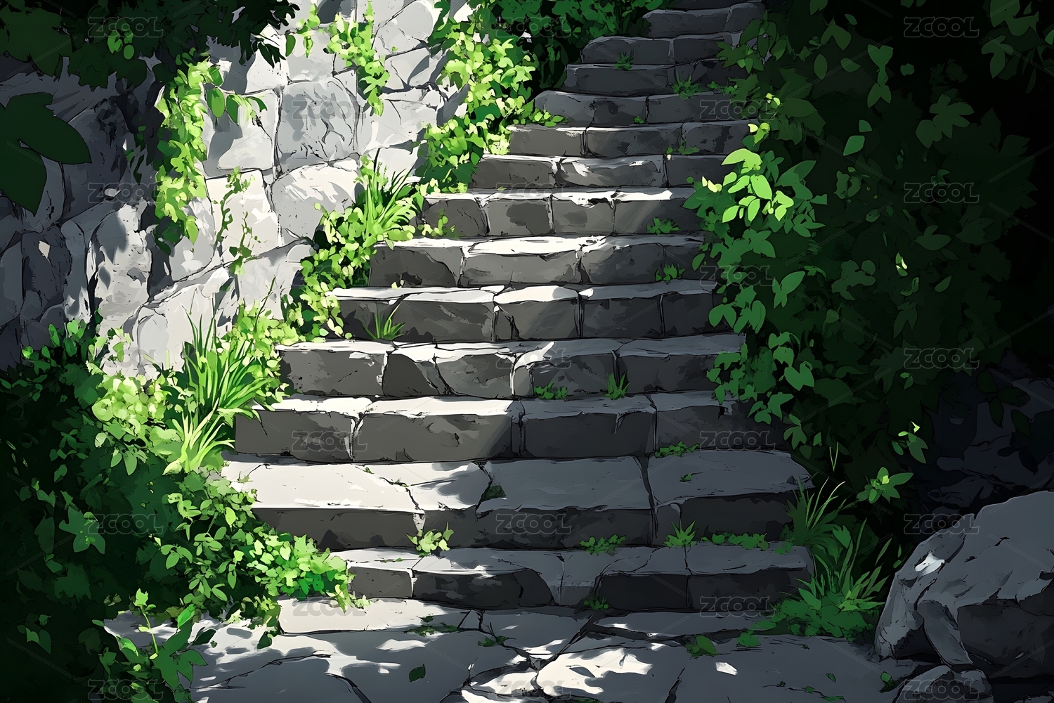 古老石阶上的绿意与光影