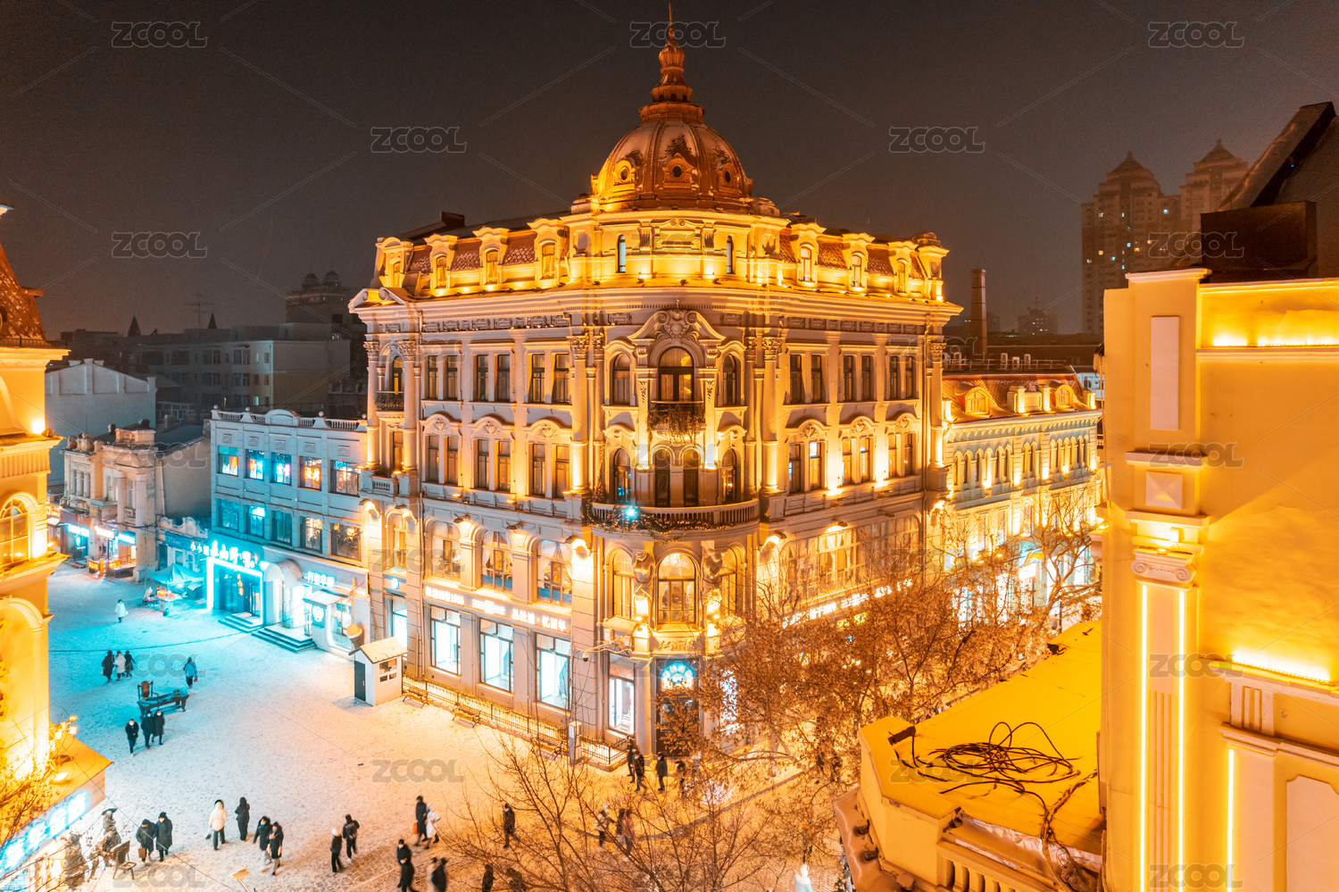 中国黑龙江哈尔滨中央大街夜晚雪景