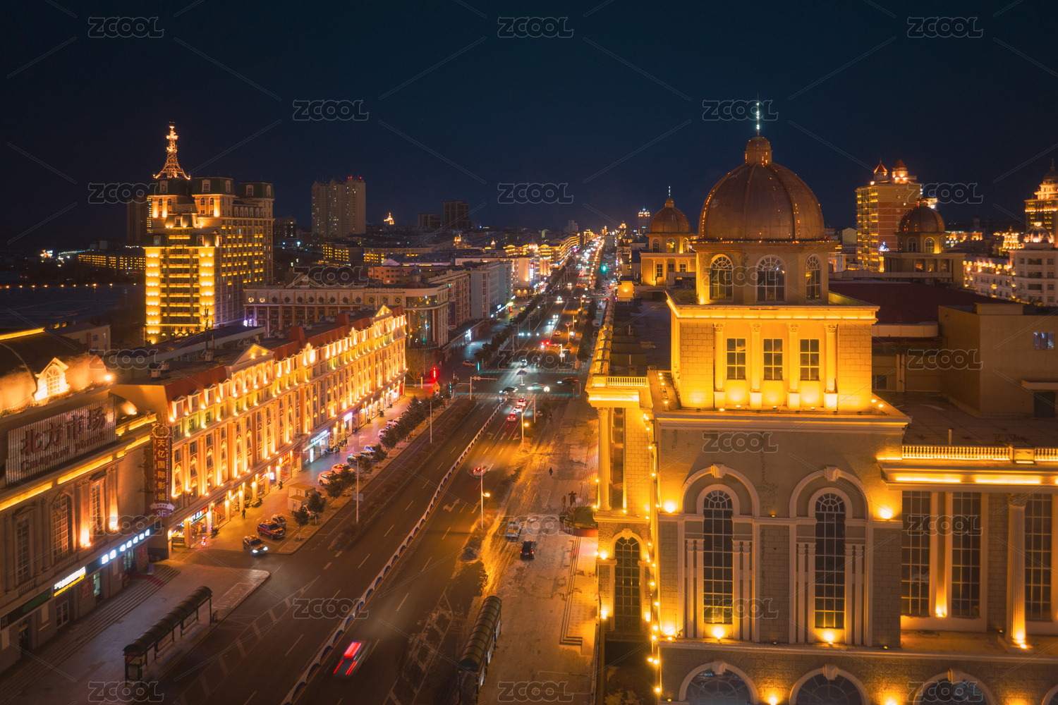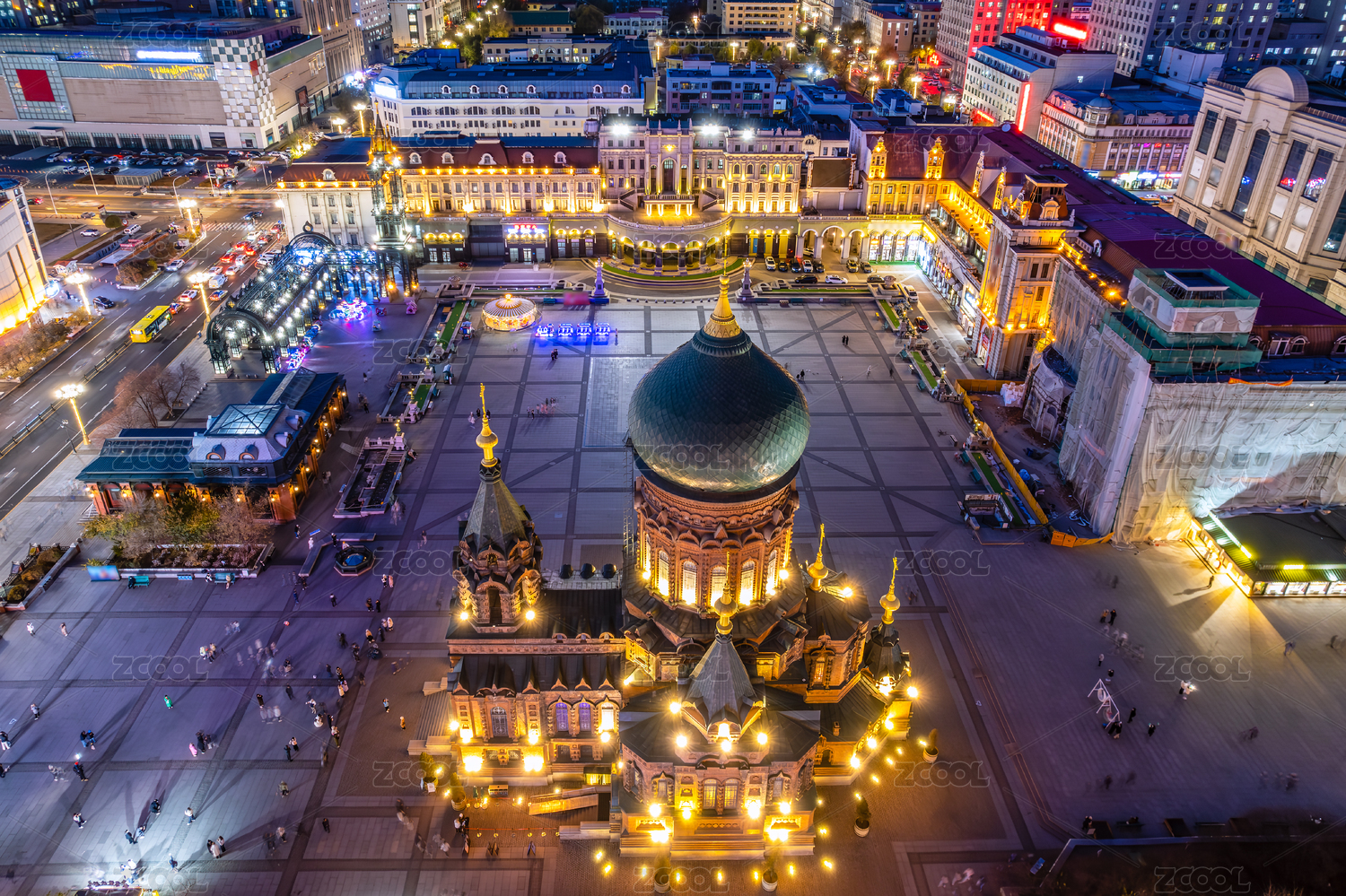 中国黑龙江哈尔滨索菲亚教堂广场夜景航拍