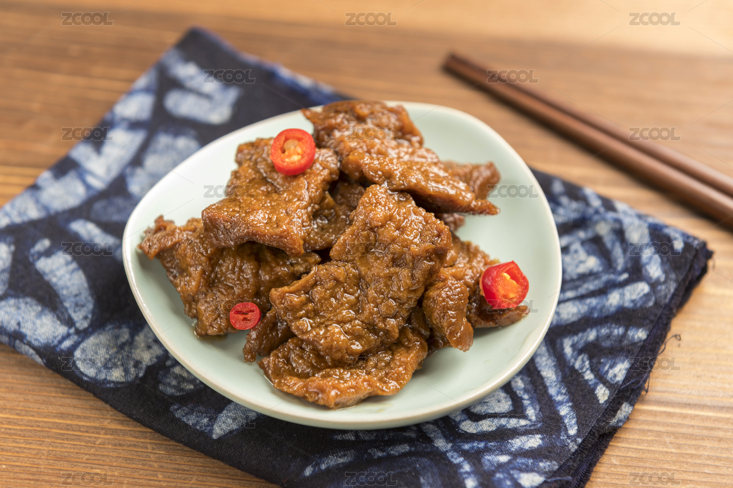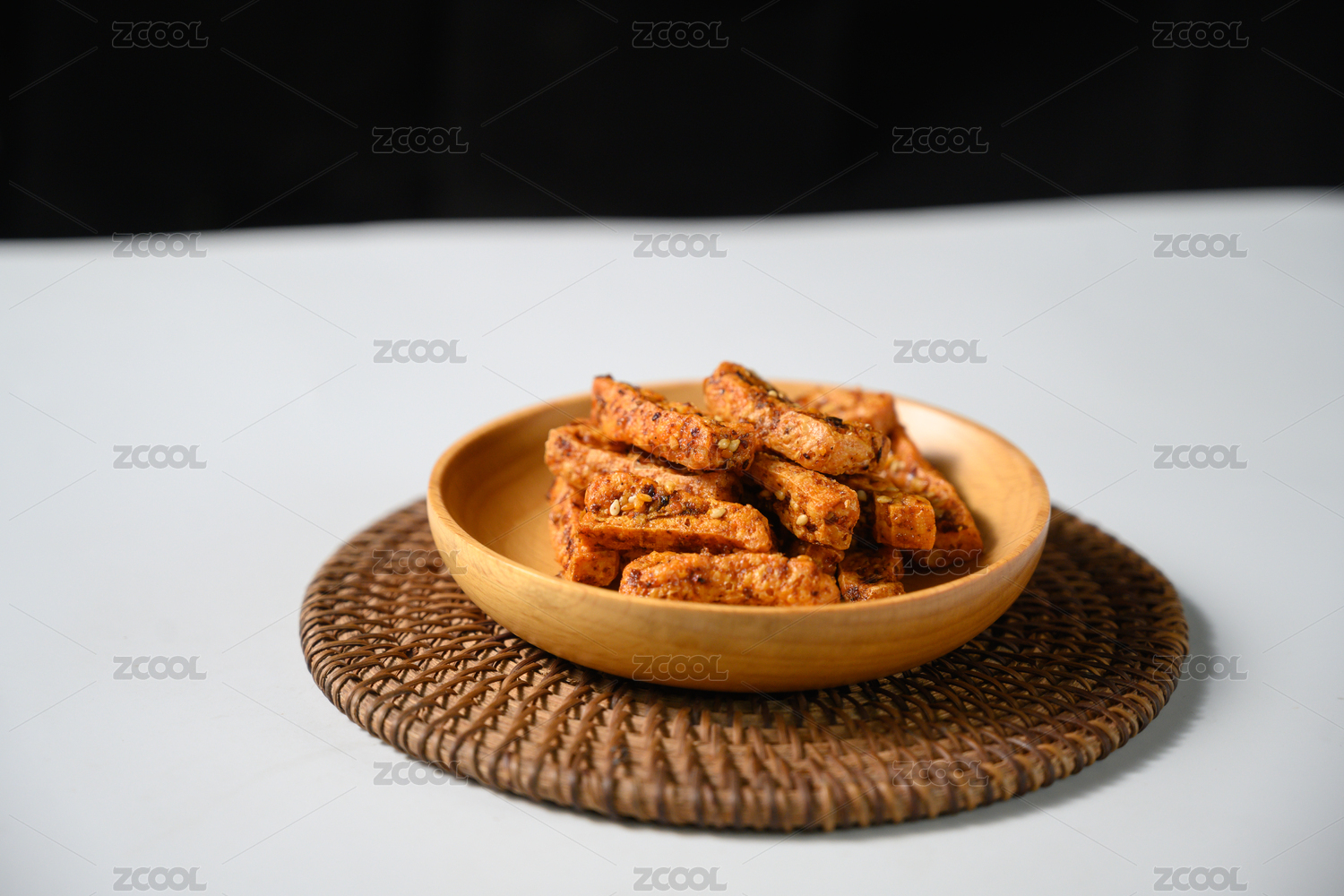 桌面上的盘子里的美味可口的香辣豆干