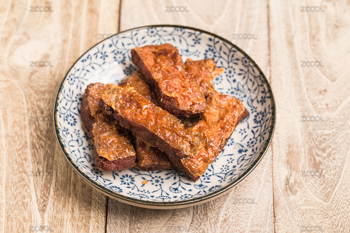 苏州传统小吃卤汁豆腐干摆放在桌面上特写