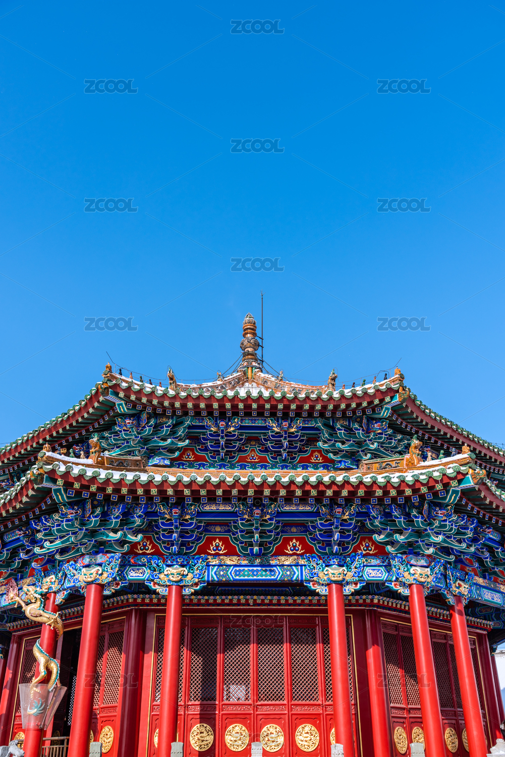 冬季蓝天下北京国子监孔庙寺庙屋檐特写
