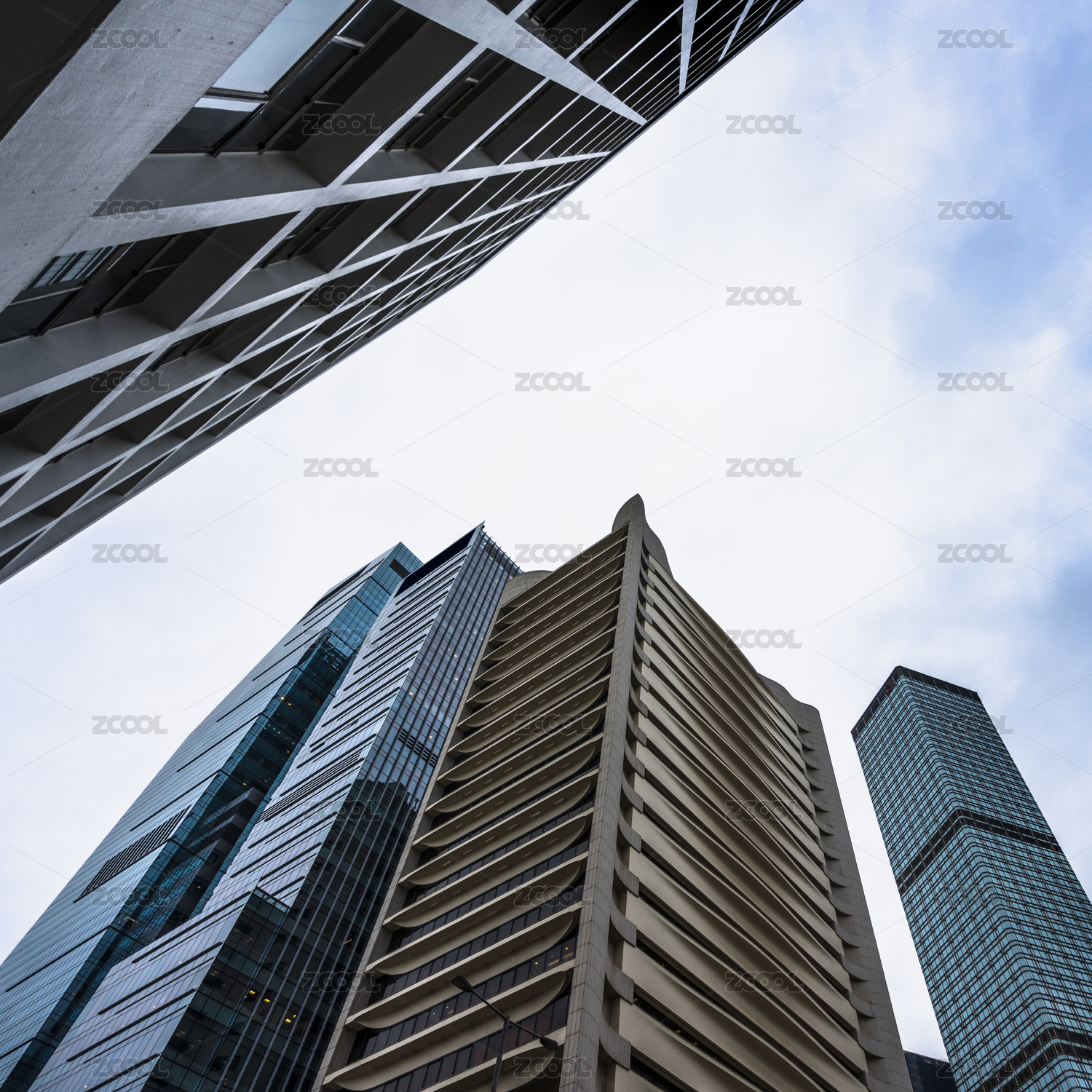 现代金属的摩天大楼,蓝色的色调,中国苏州的低角度视图。