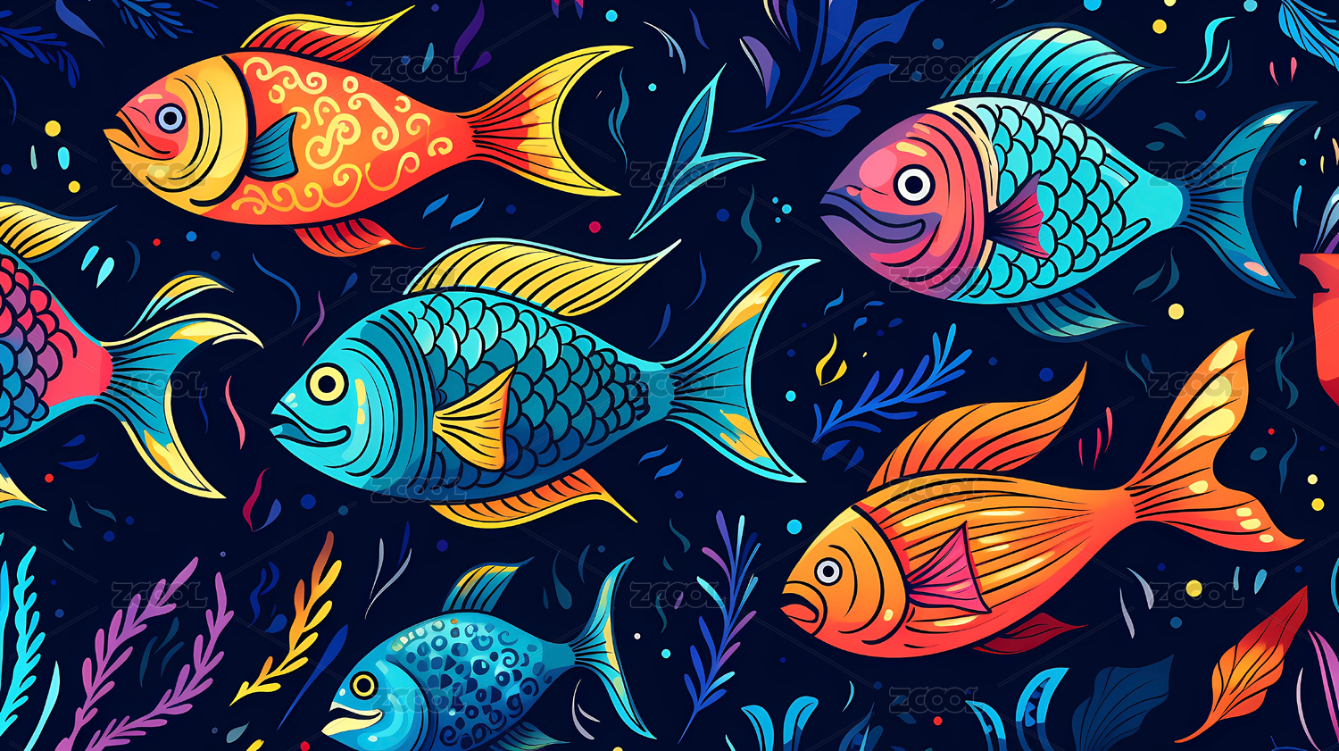 手绘卡通漂亮的鱼类元素花纹背景素材