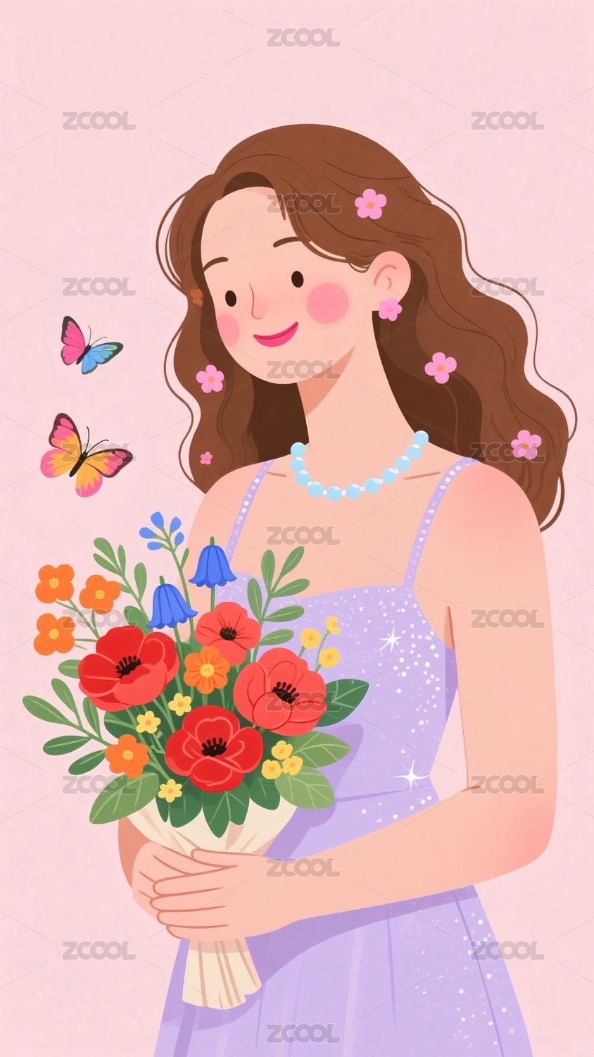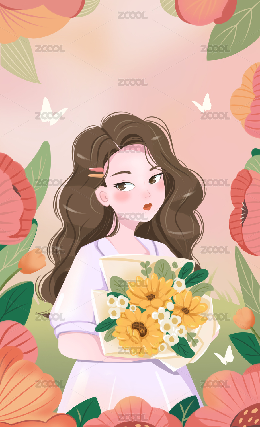 情人节拿着玫瑰鲜花的文艺女孩插画