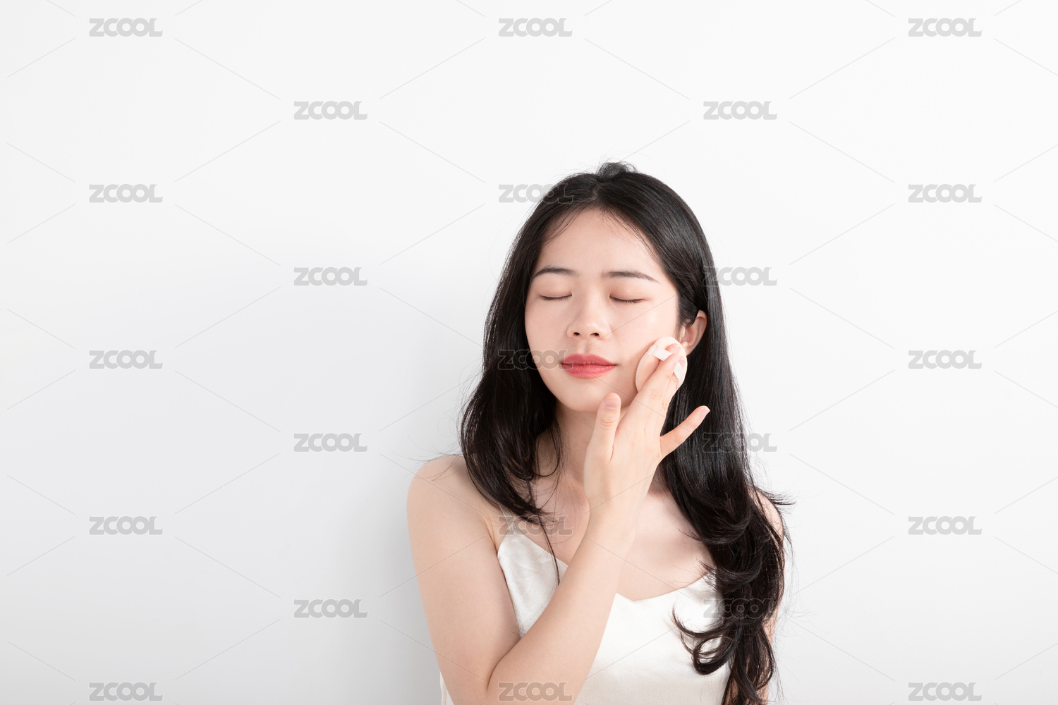 白色背景前使用气垫粉扑的美女