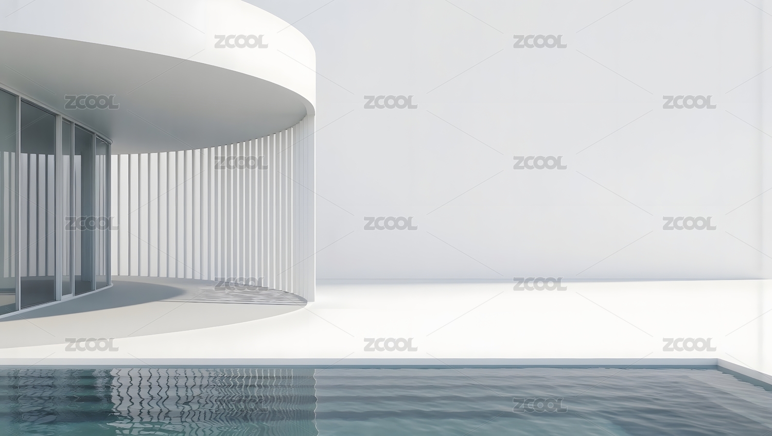 白色带有水面的室内场景3D渲染