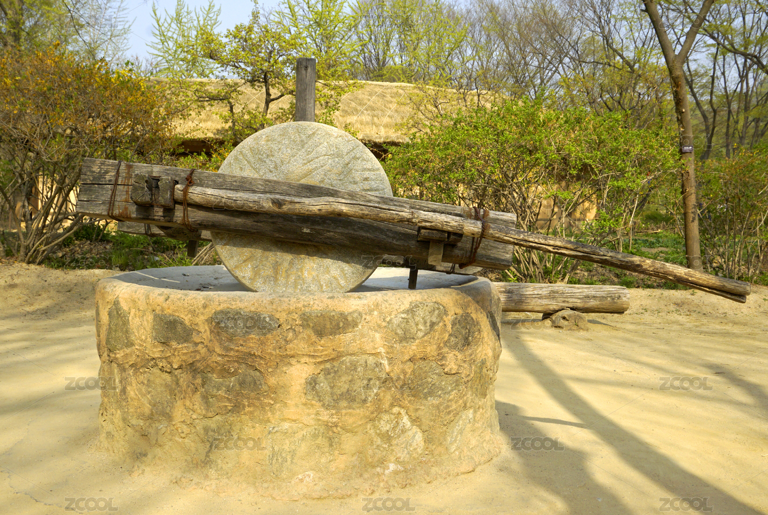中国山东省临沂市沂蒙红色影视基地内沂蒙山村的石碾子