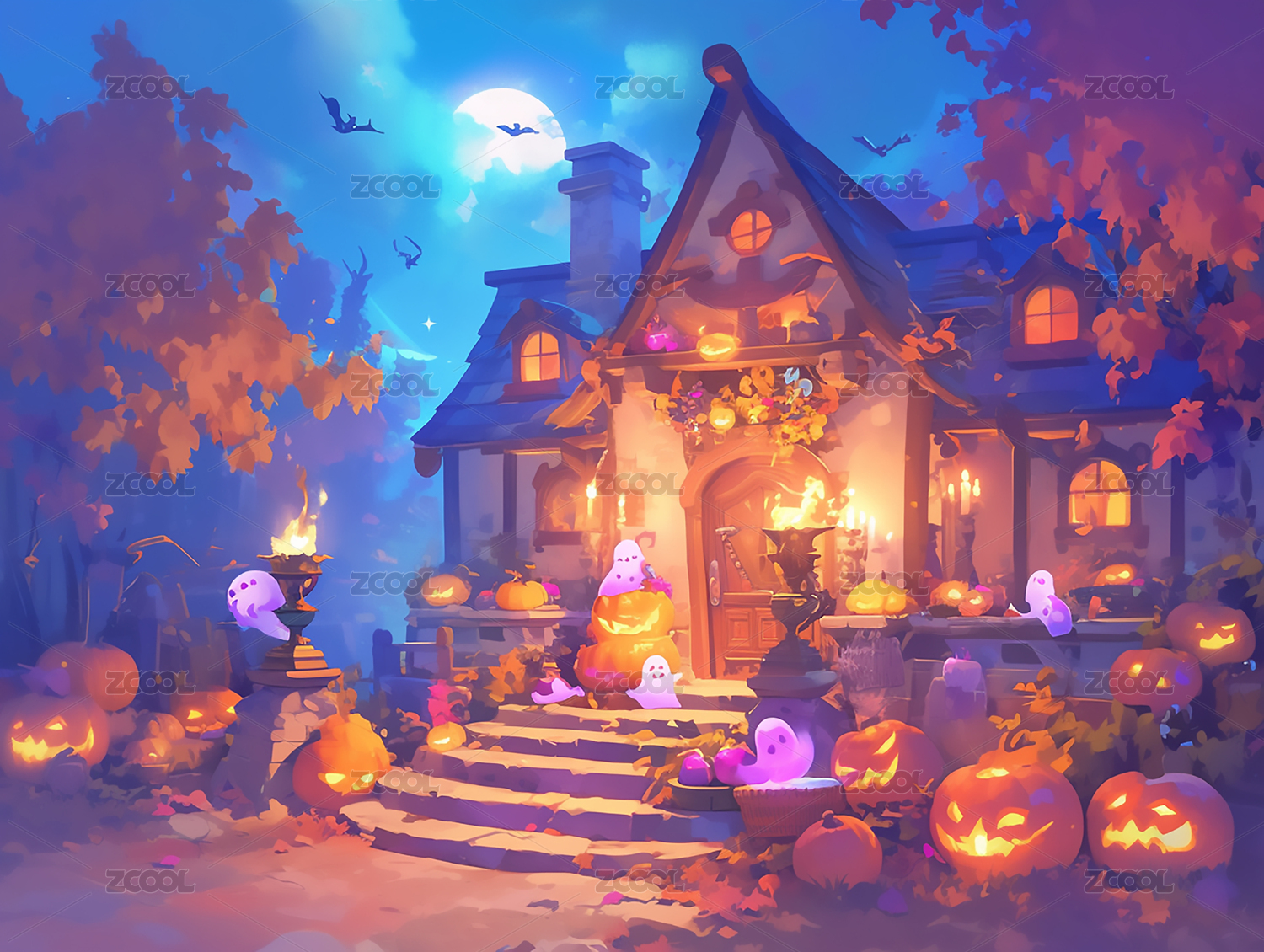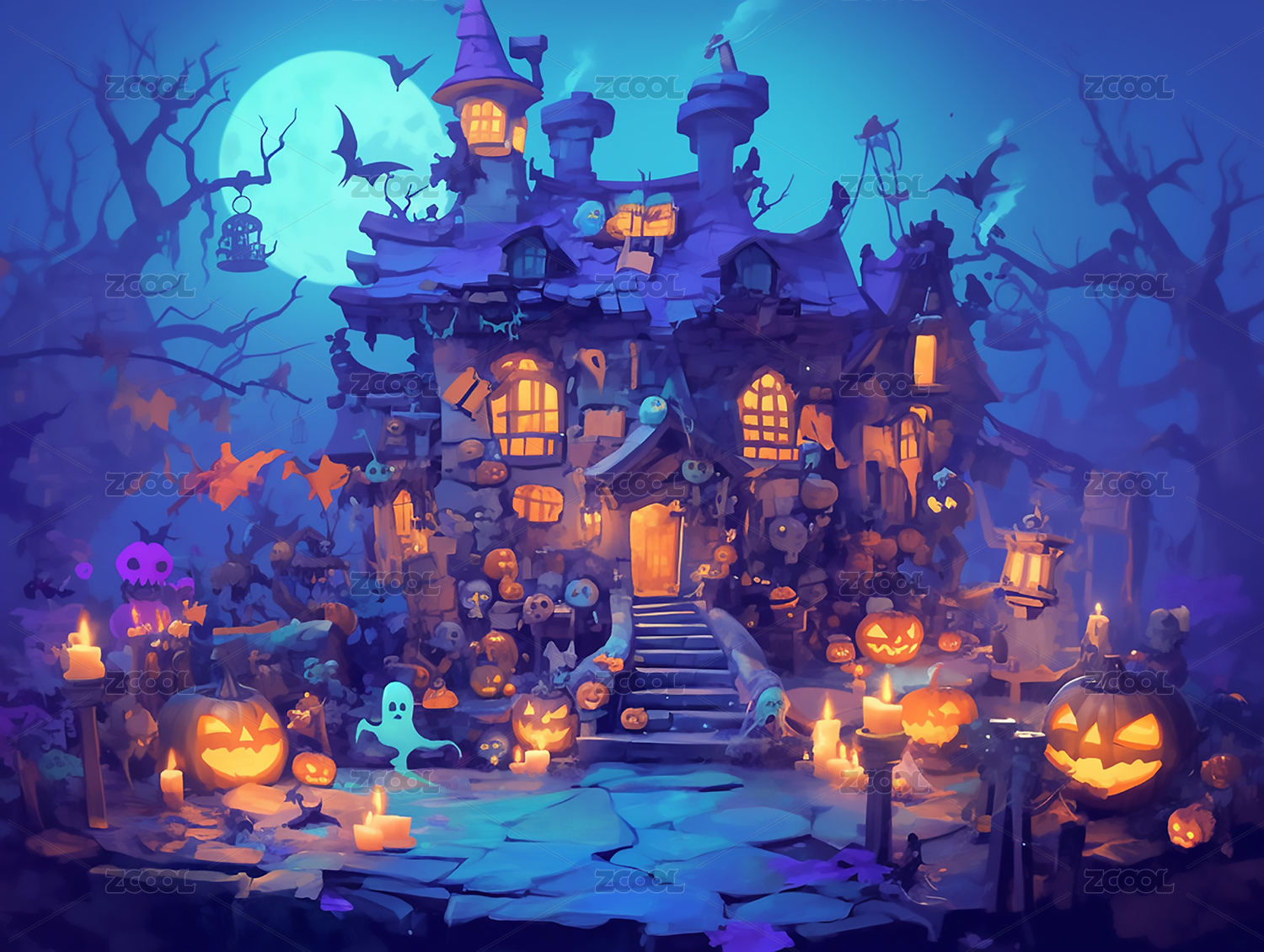 万圣节,空心南瓜灯,插画,手绘,壁纸,背景,可爱,卡通,装扮,城堡