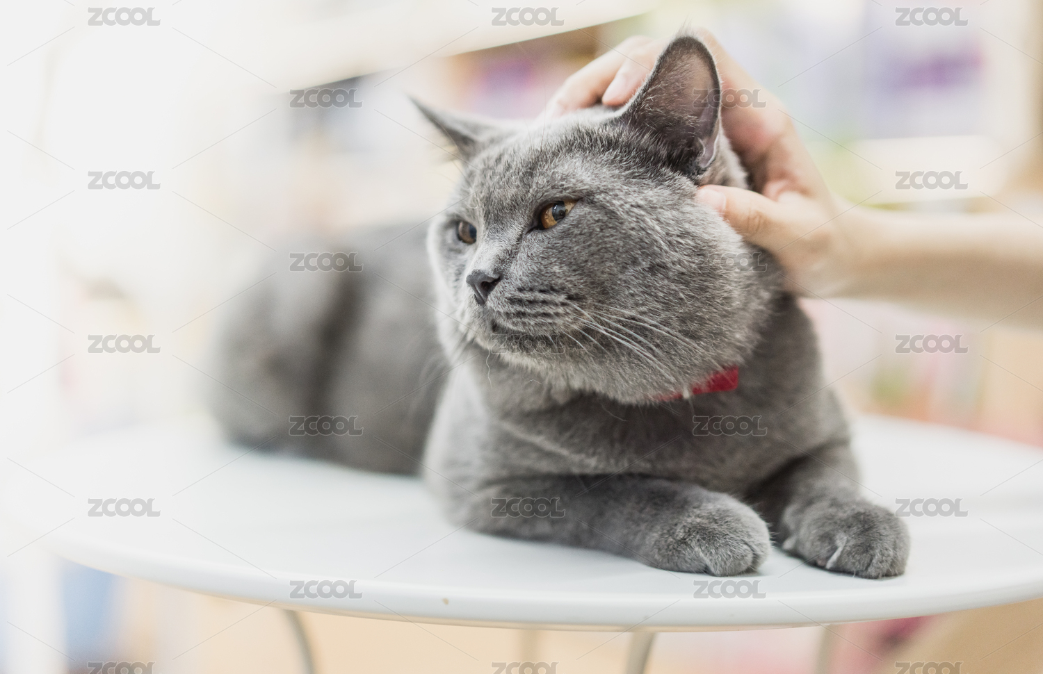 一只手正在抚摸趴在桌子上的英短蓝猫