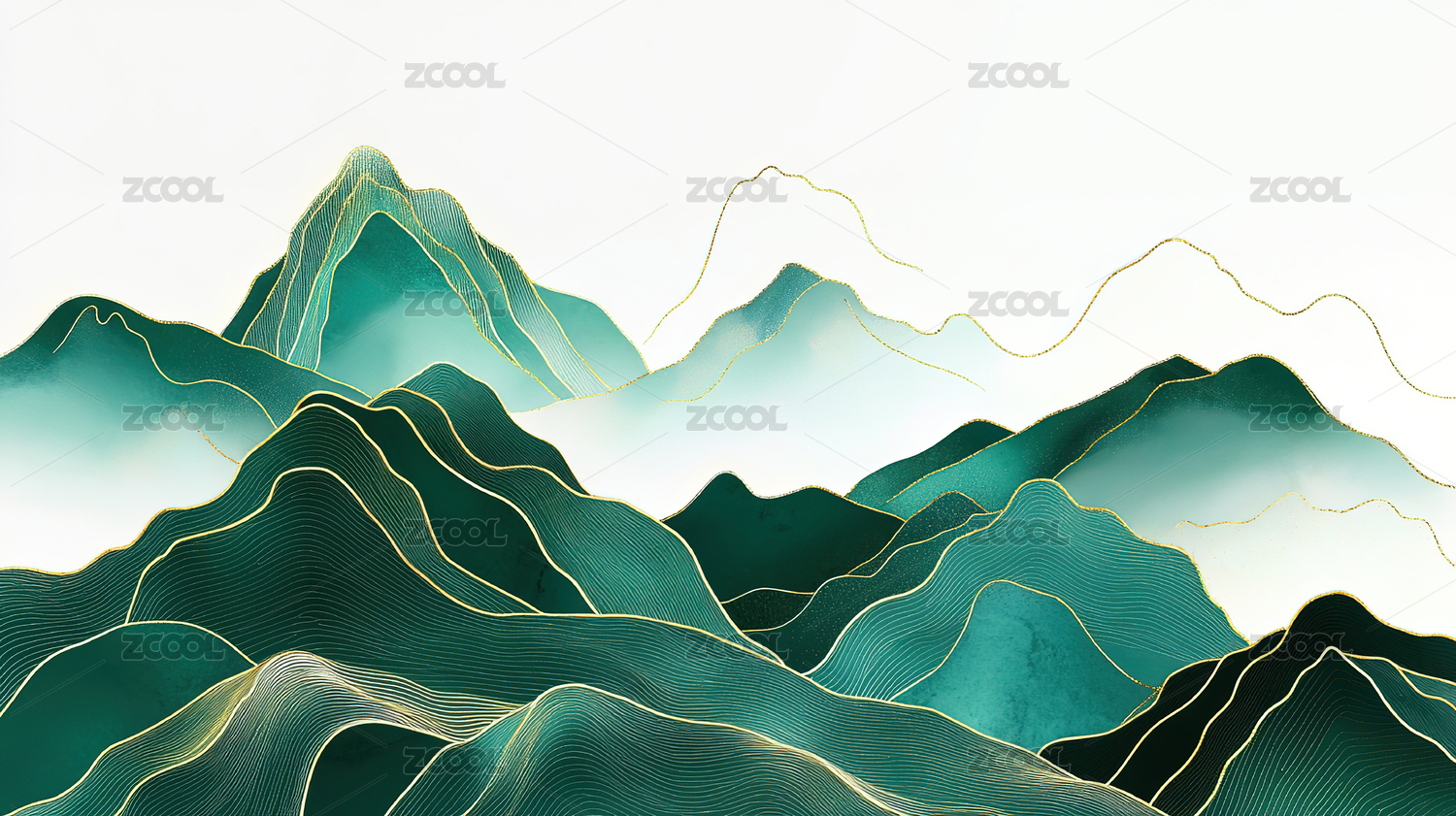 层叠青绿山峦的抽象线条艺术风景