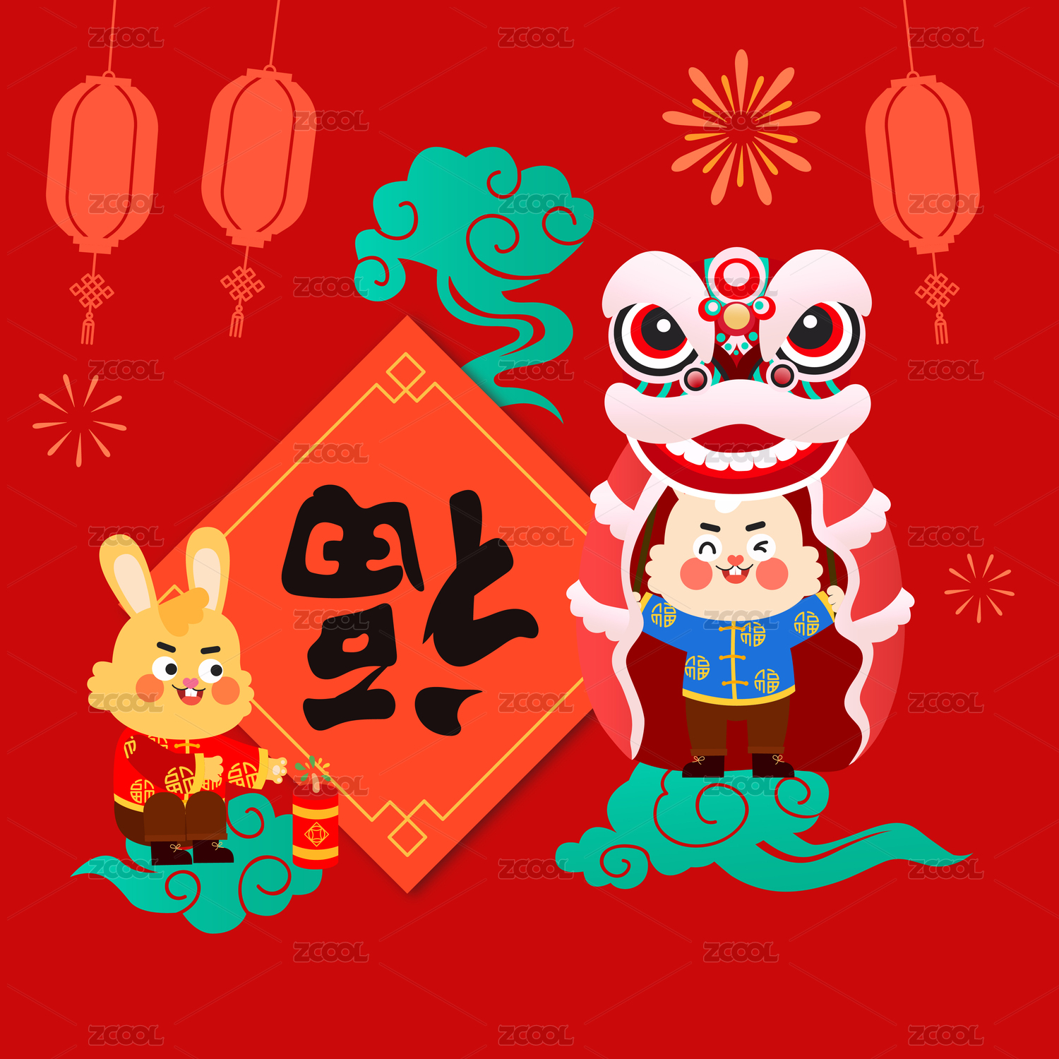 原创矢量中国风国潮插画喜庆鼠年老鼠舞狮