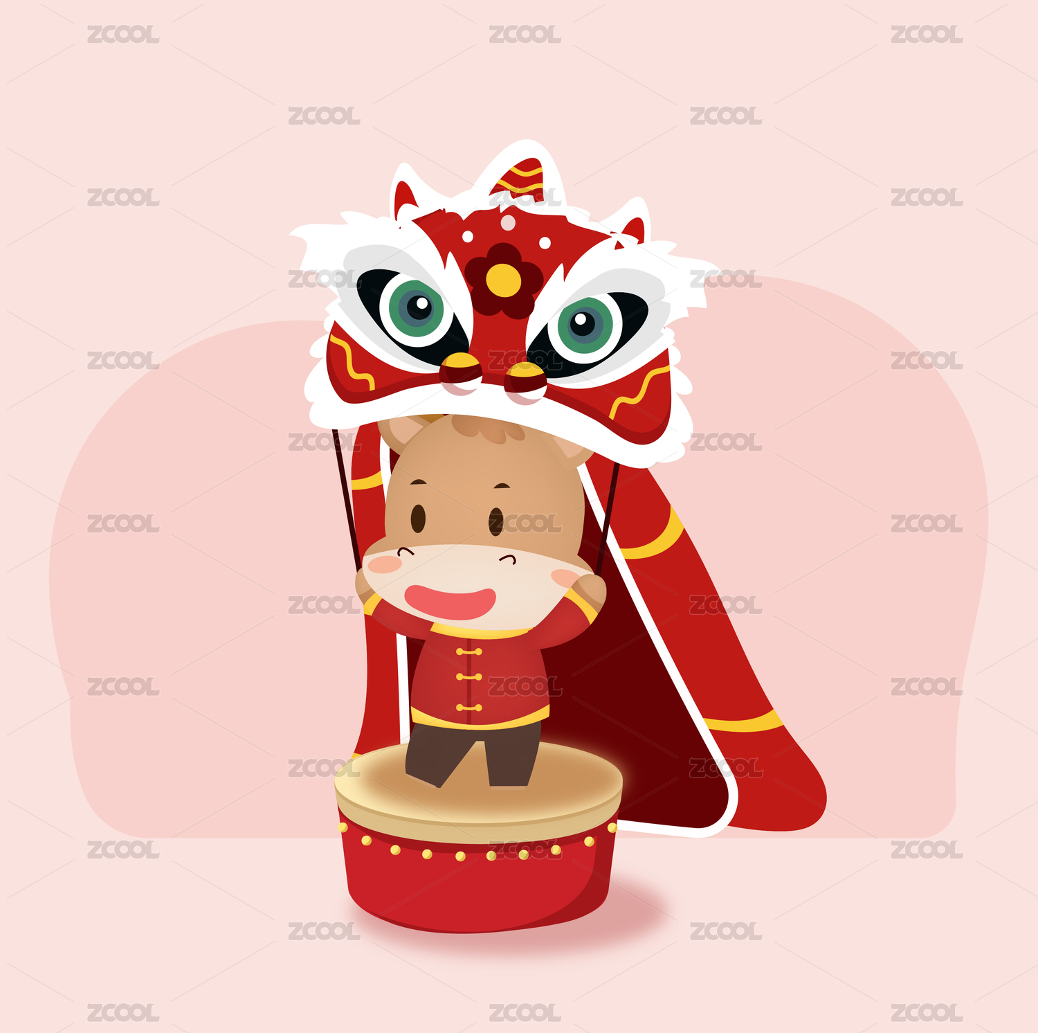 新年2021年牛年春节,牛在舞狮庆祝节日