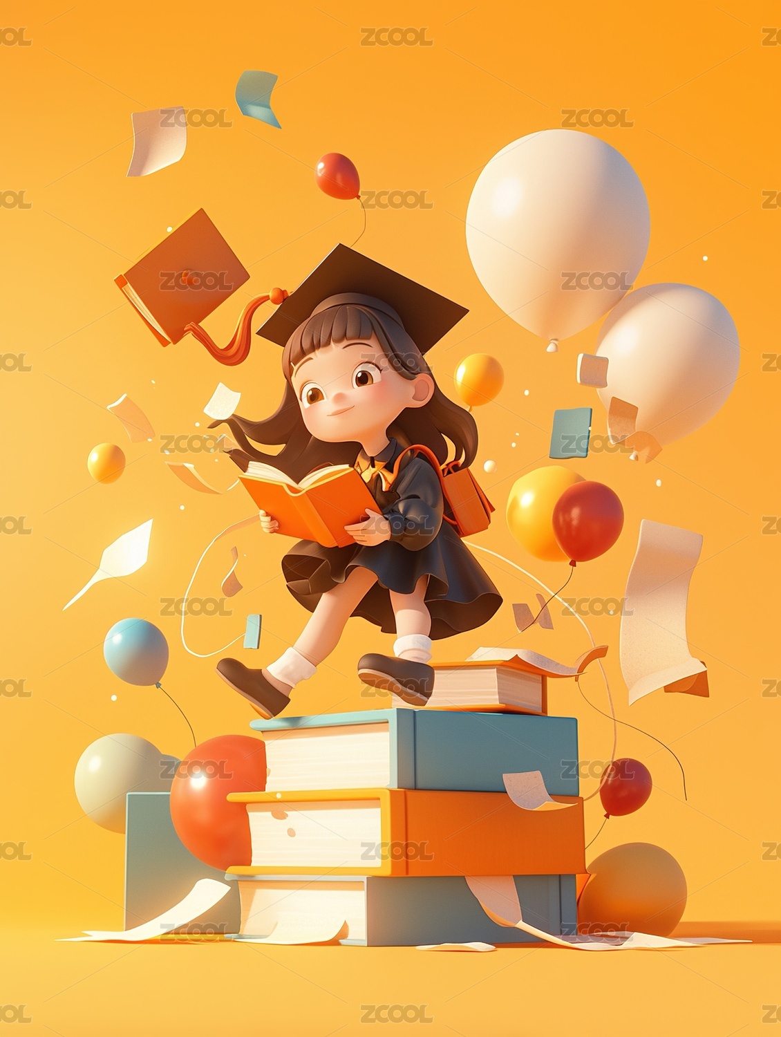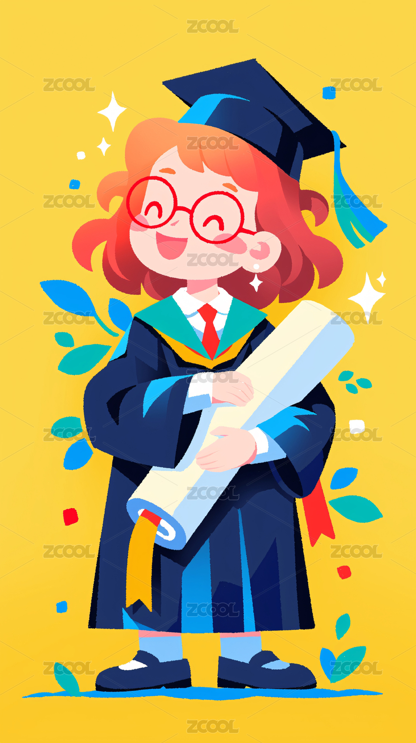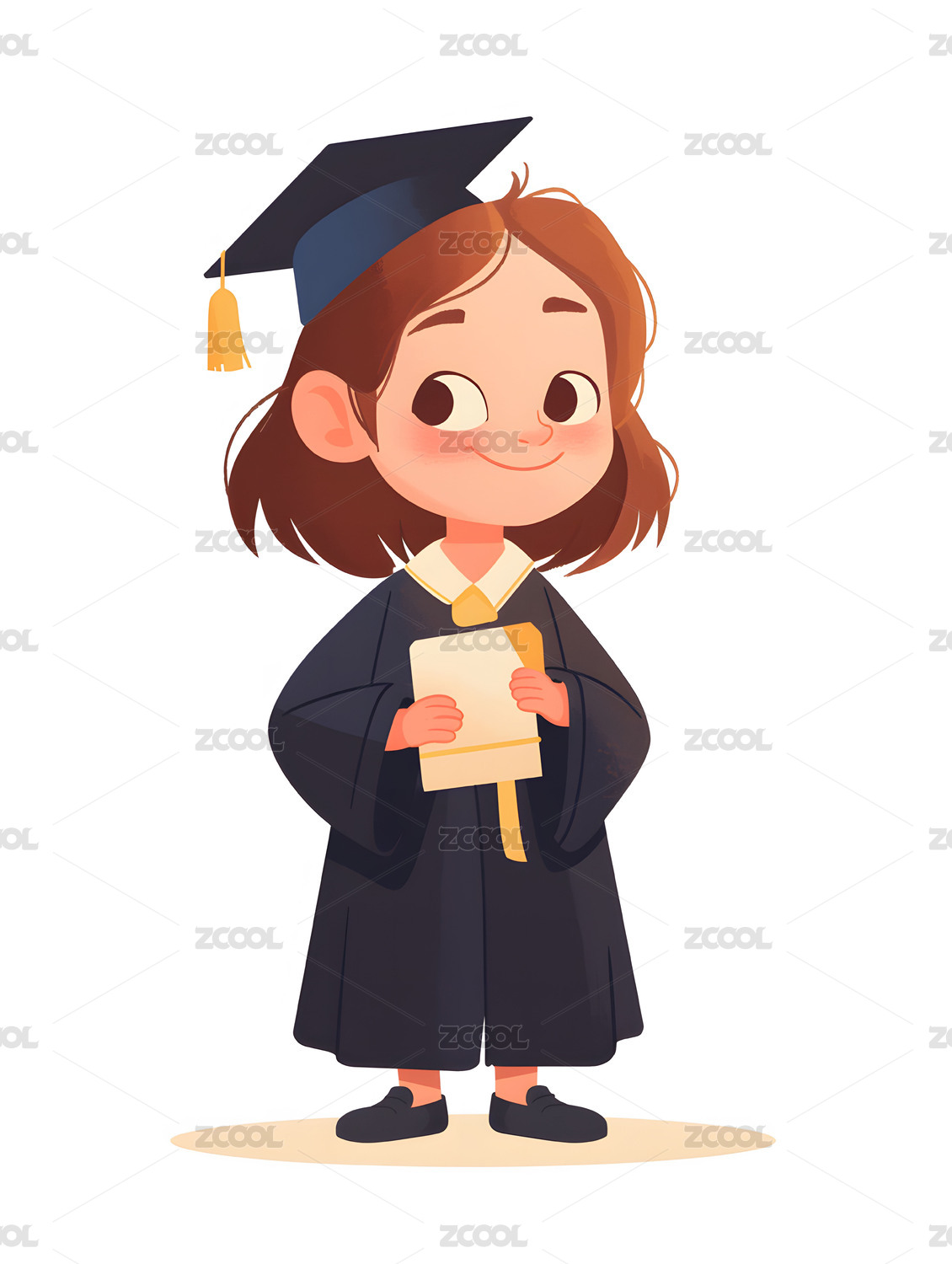 少年戴着学士帽穿着学士服拿着纸张书籍插画