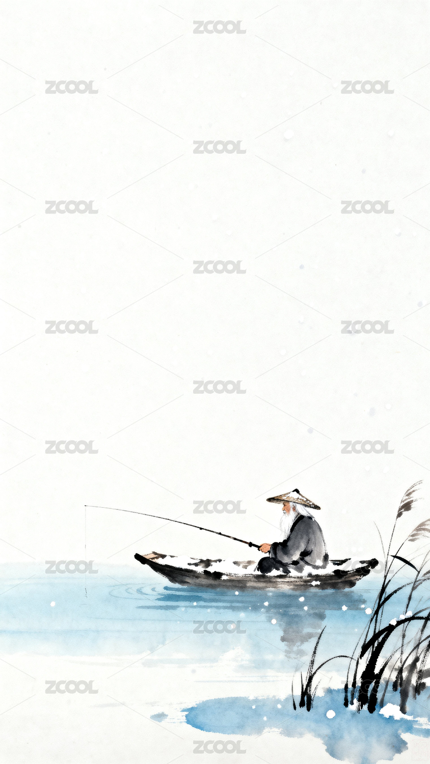 宁静湖面孤舟独桨,雾气缭绕水天一色