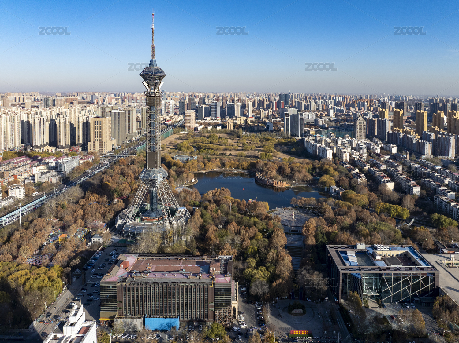 航拍河北省石家庄市石家庄电视塔、世纪公园