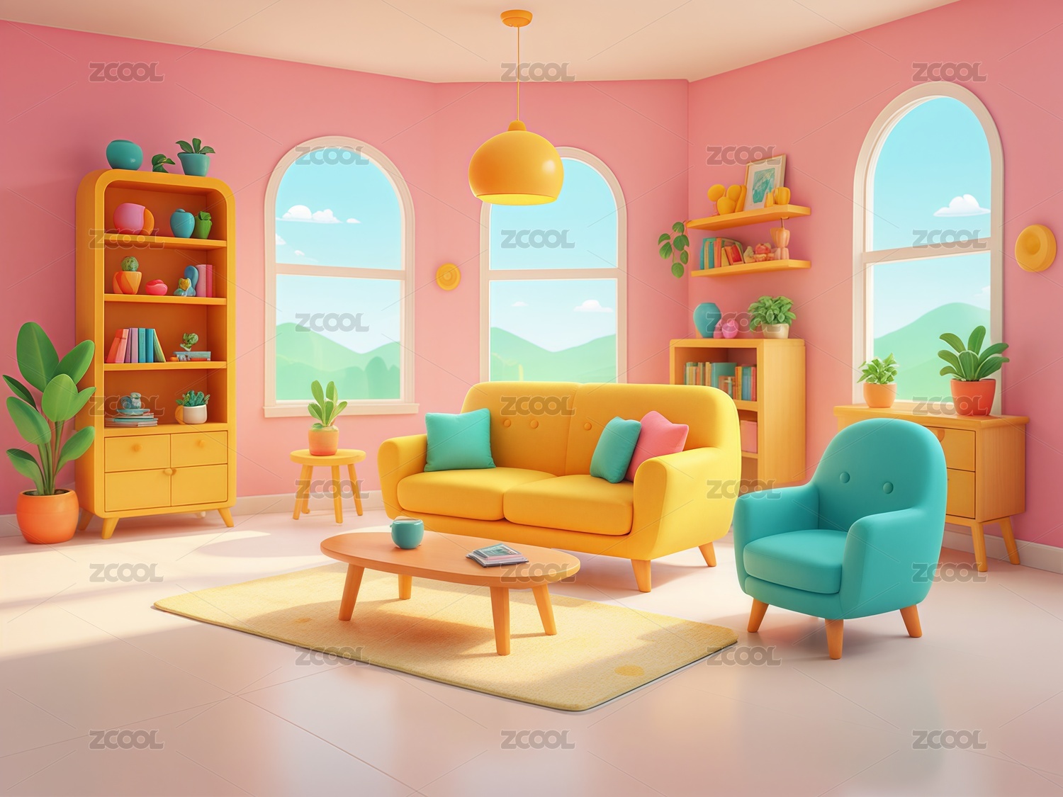 三维渲染的黄色卡通书房小屋