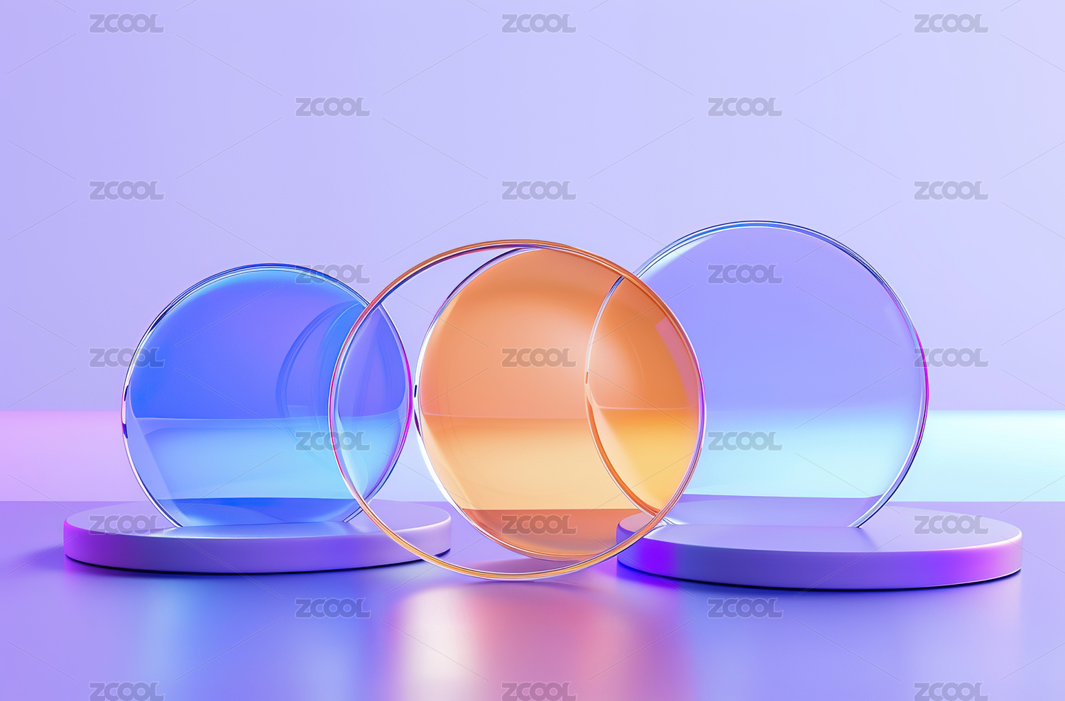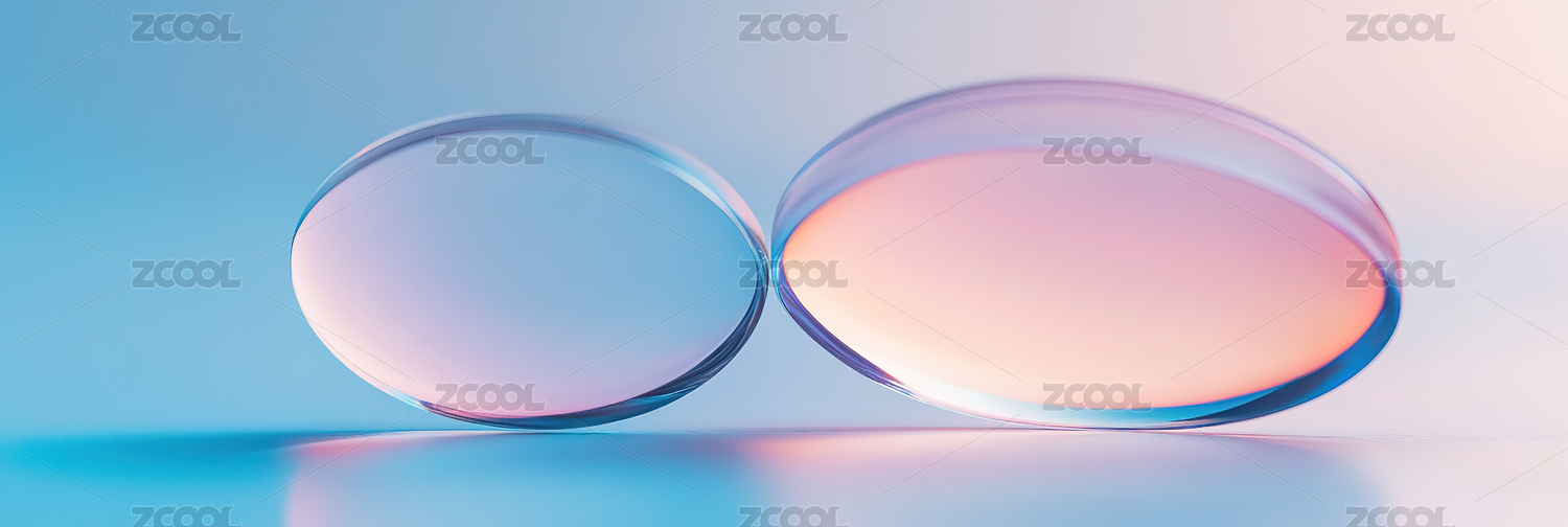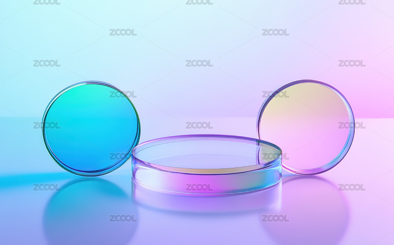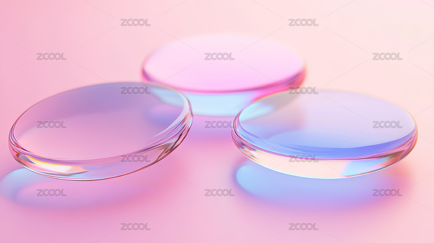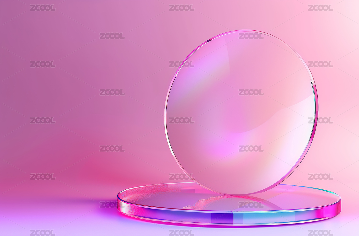 粉色蓝色梦幻背景下悬浮透明圆盘
