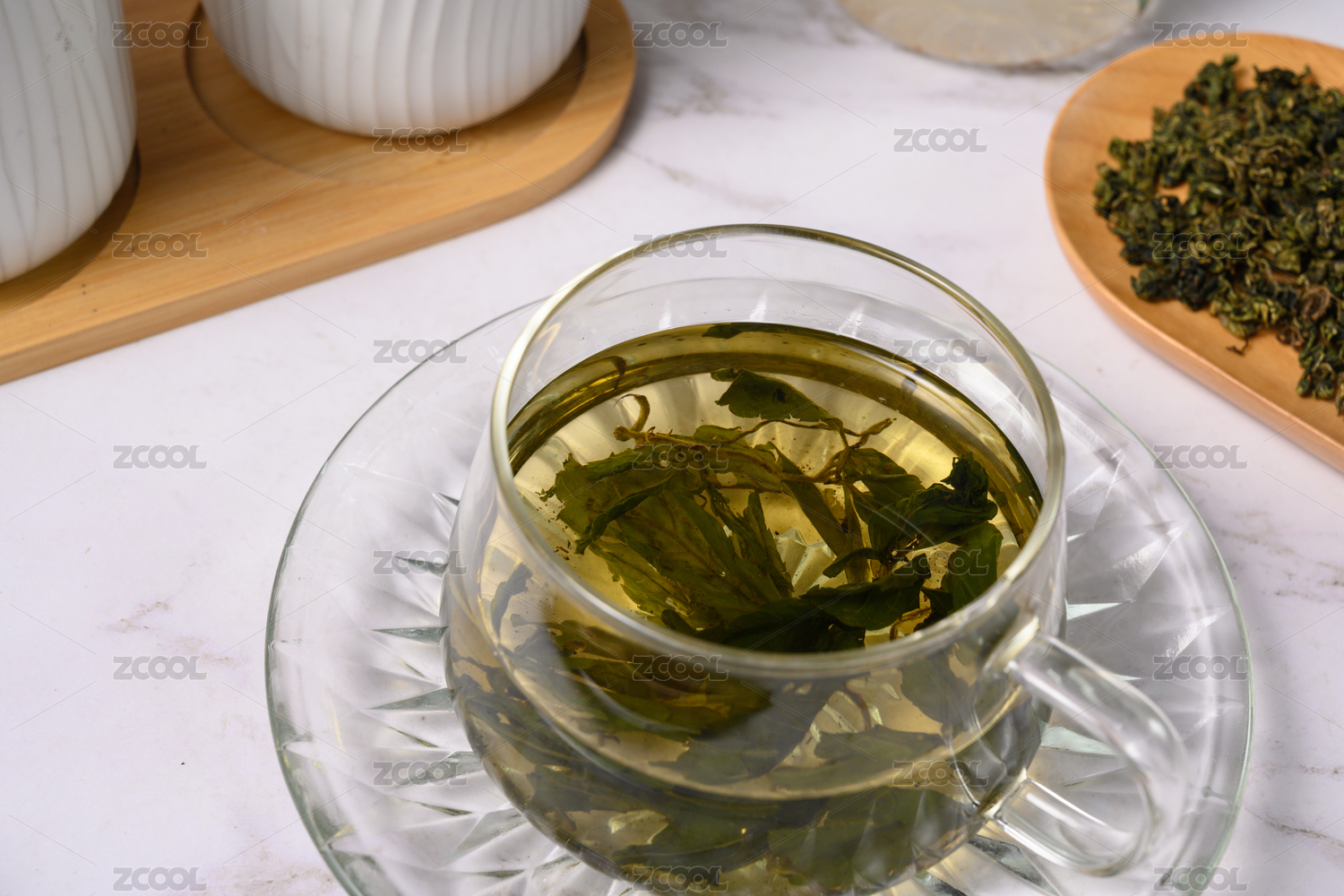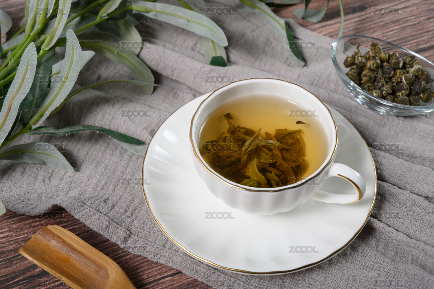 桌面上的杯子里的甘甜可口的茉莉吐珠茶