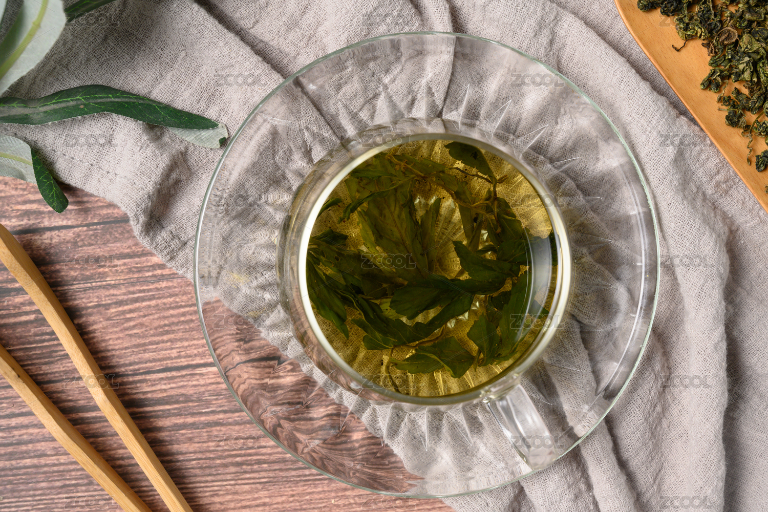 桌面上的杯子里的甘甜可口的绞股蓝茶