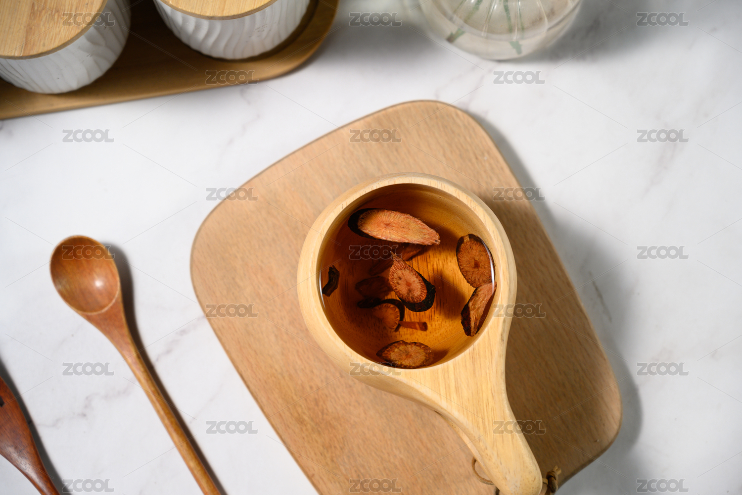 桌面上的杯子里的甘甜可口的山茱萸茶