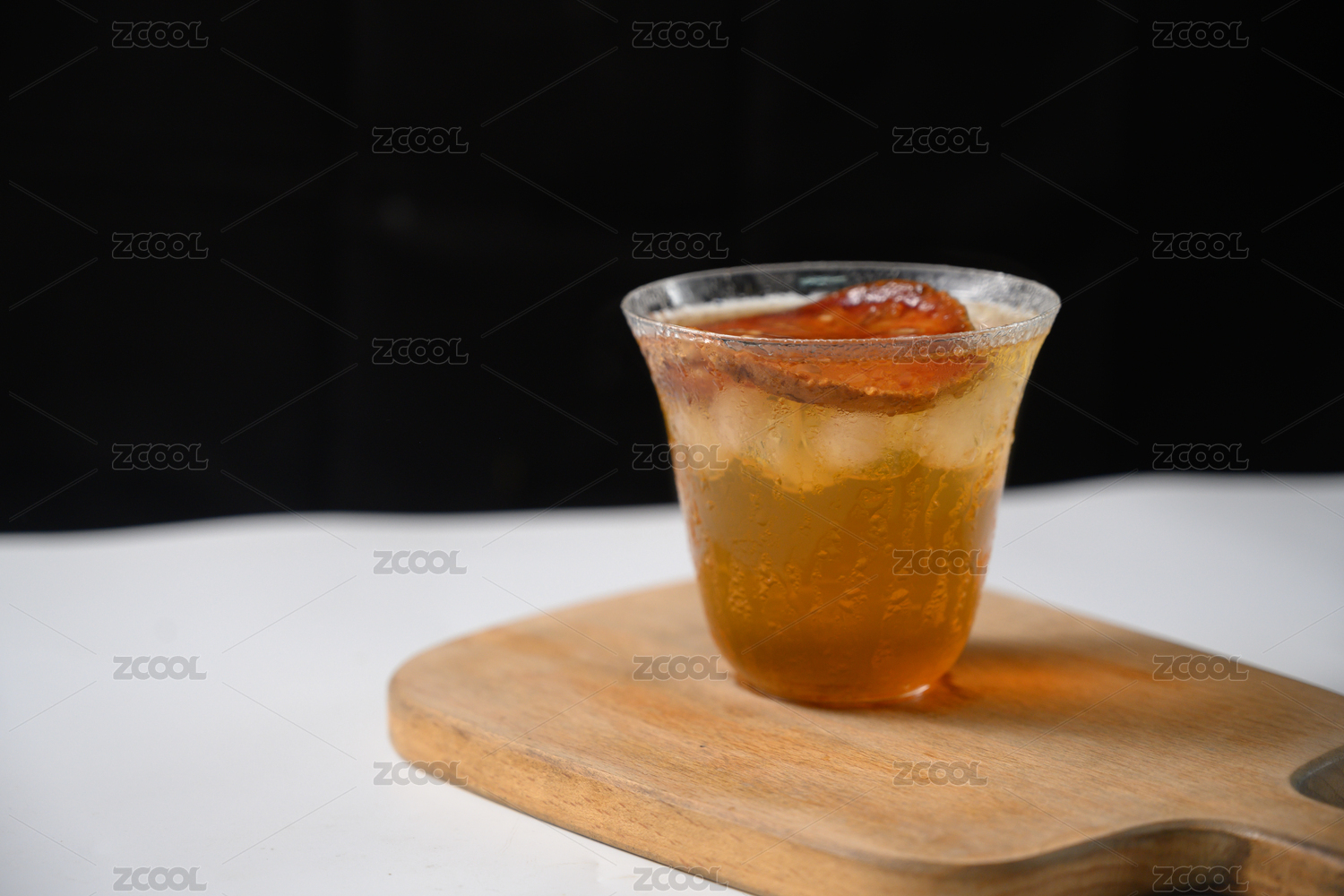 桌面上的杯子里的甘甜可口的冰咖啡果皮茶