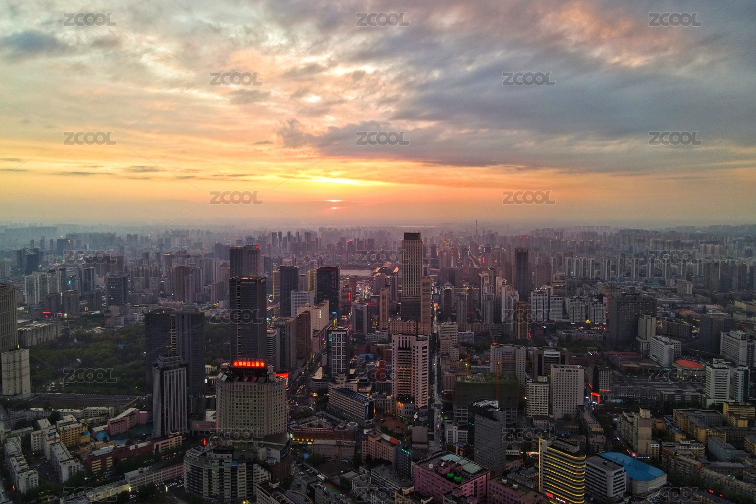 中国沈阳青年大街CBD全景航拍夕阳晚霞