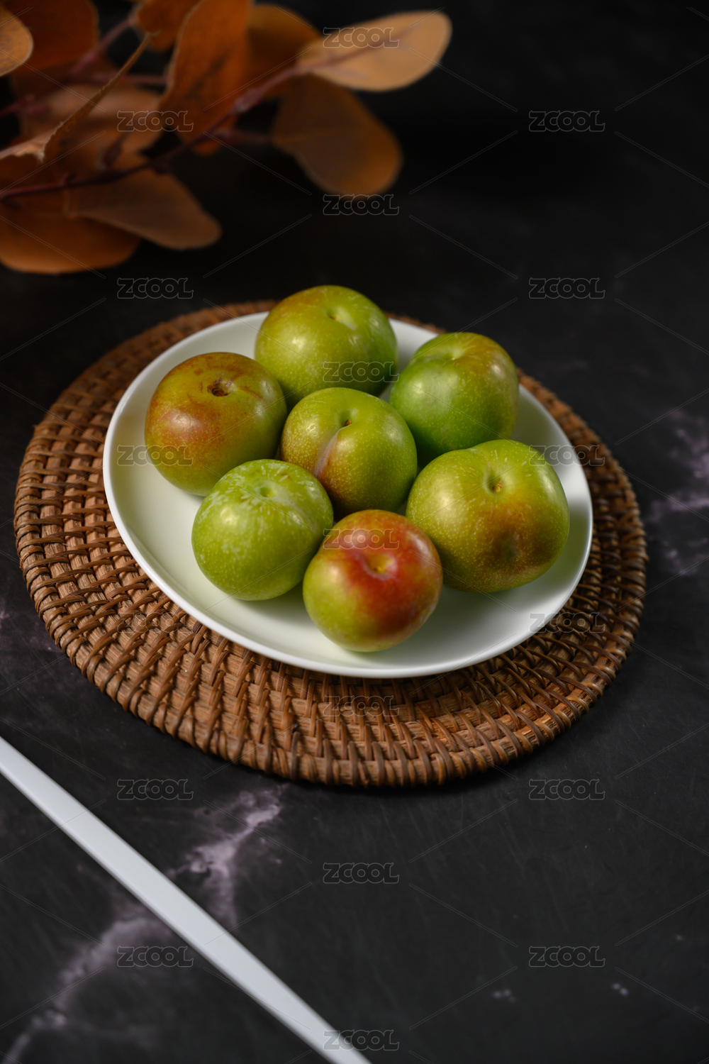 桌面上的盘子里的美味可口的四季李子