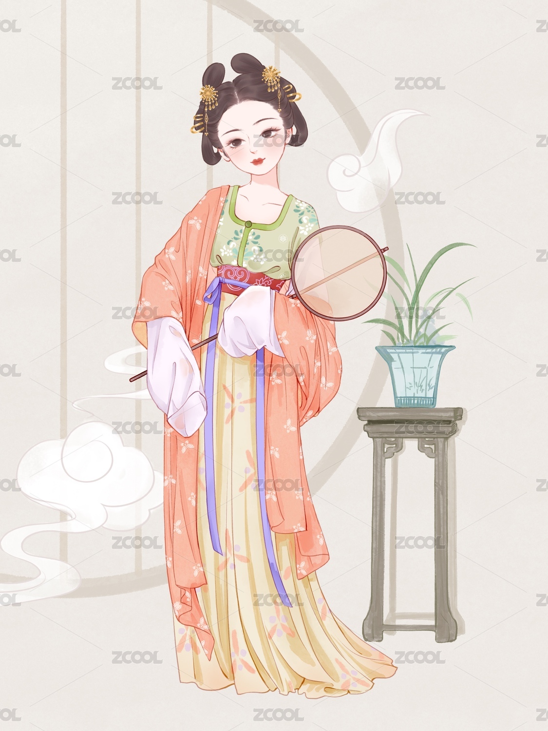 拿着扇子的汉服女子和柳叶燕子等插画圆形版