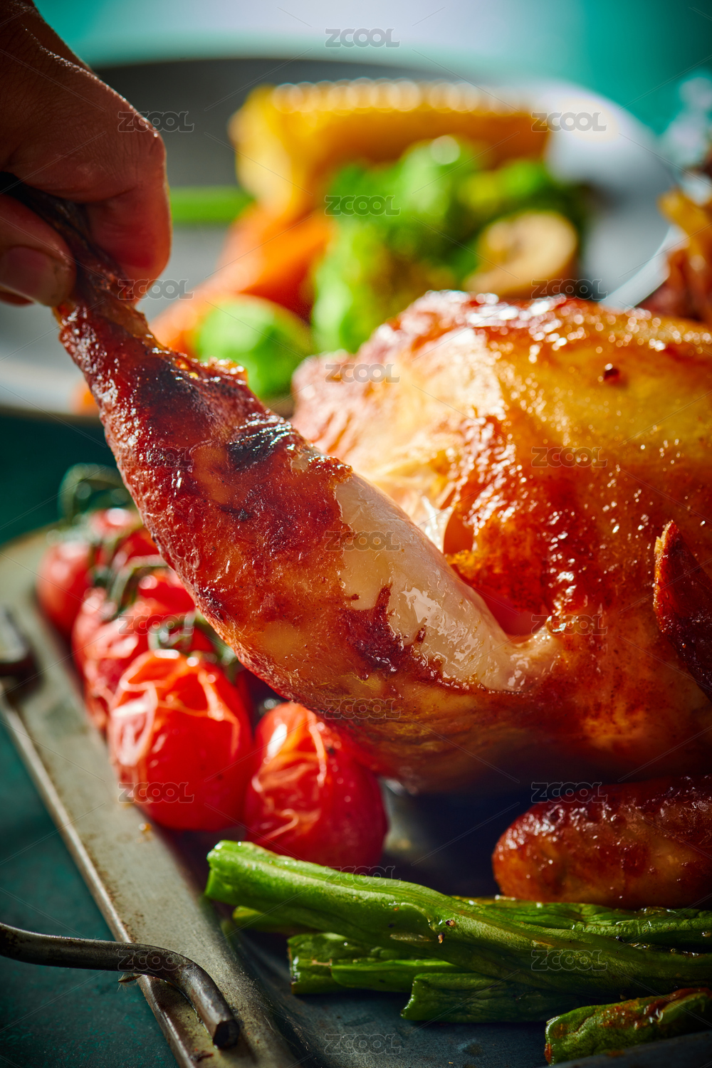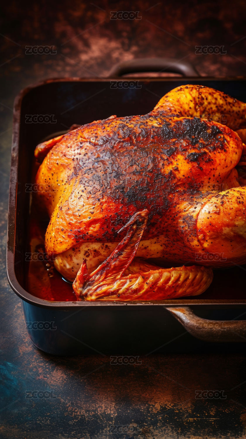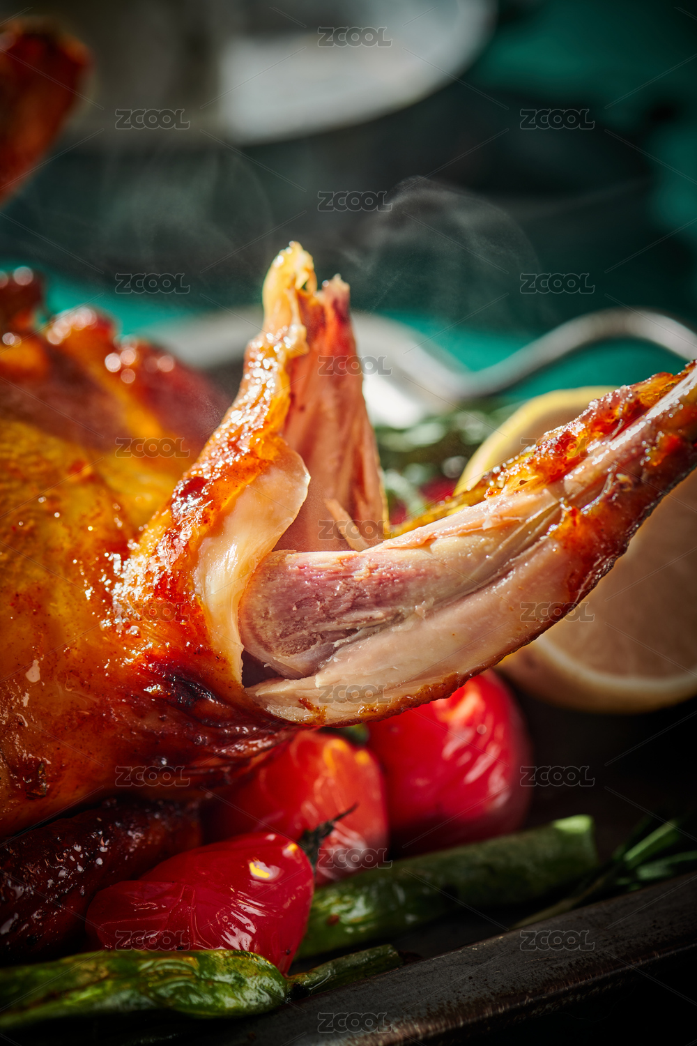 冒烟的整只烤鸡放在铺满香料的石头容器里