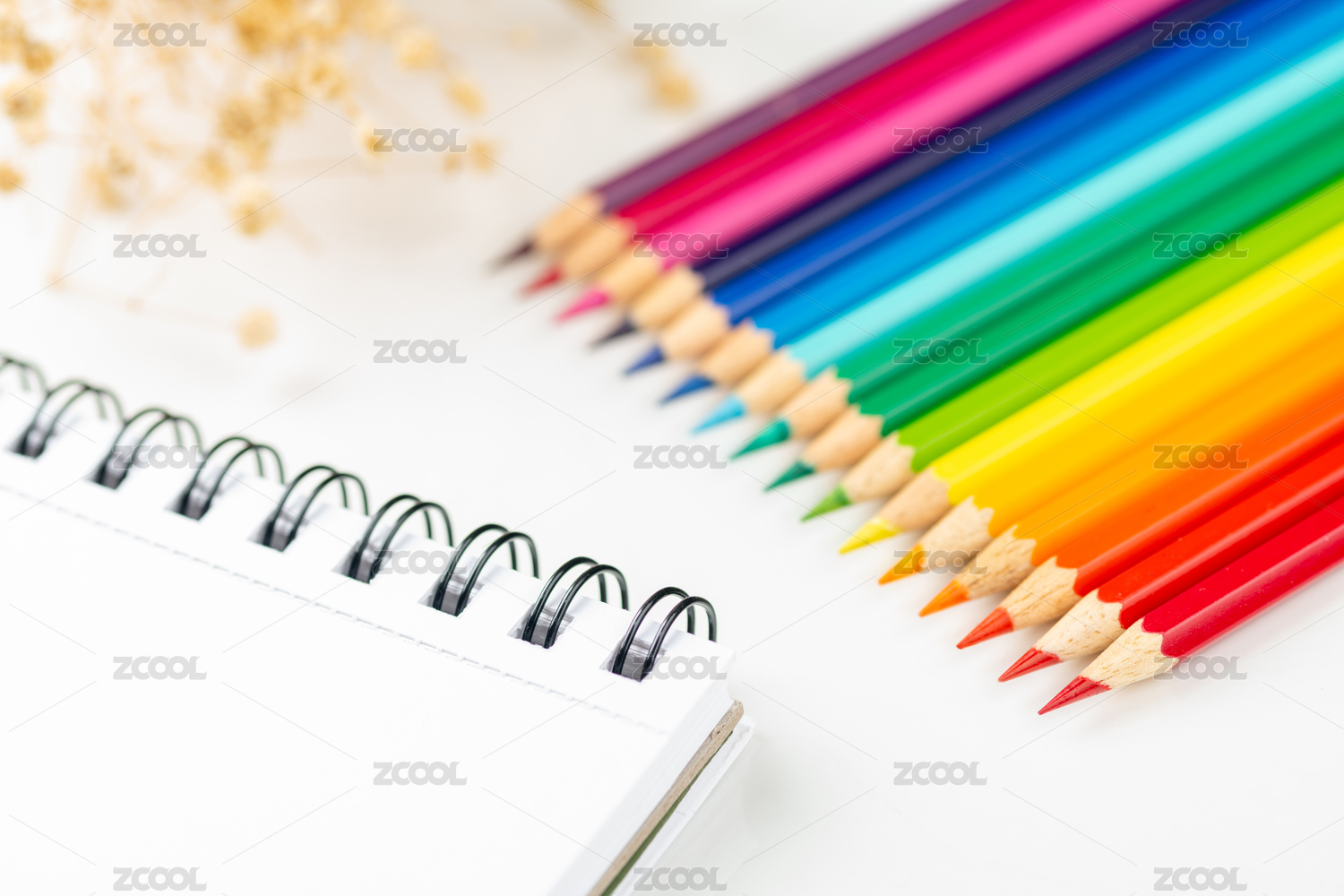 拍成上升曲线的彩色铅笔和白色的纸张背景