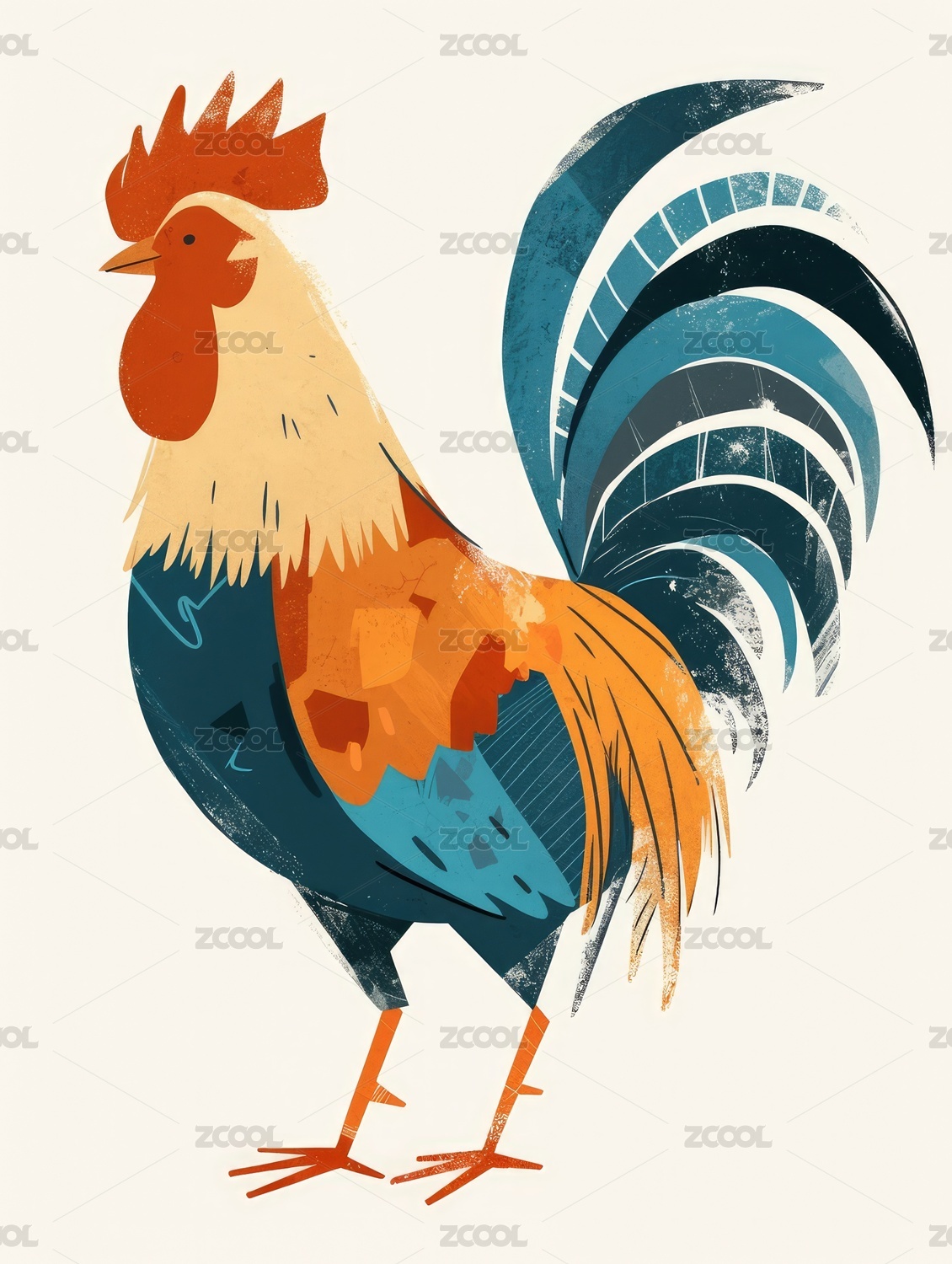 版画风格的彩色大公鸡