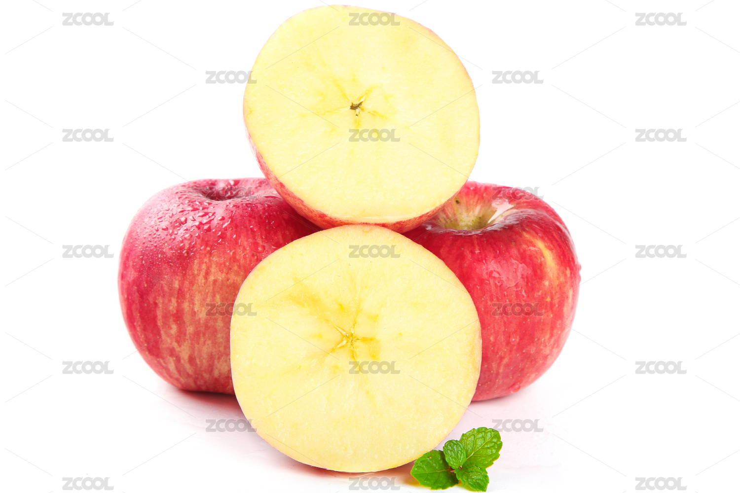 白底上放着红富士苹果和切面的苹果