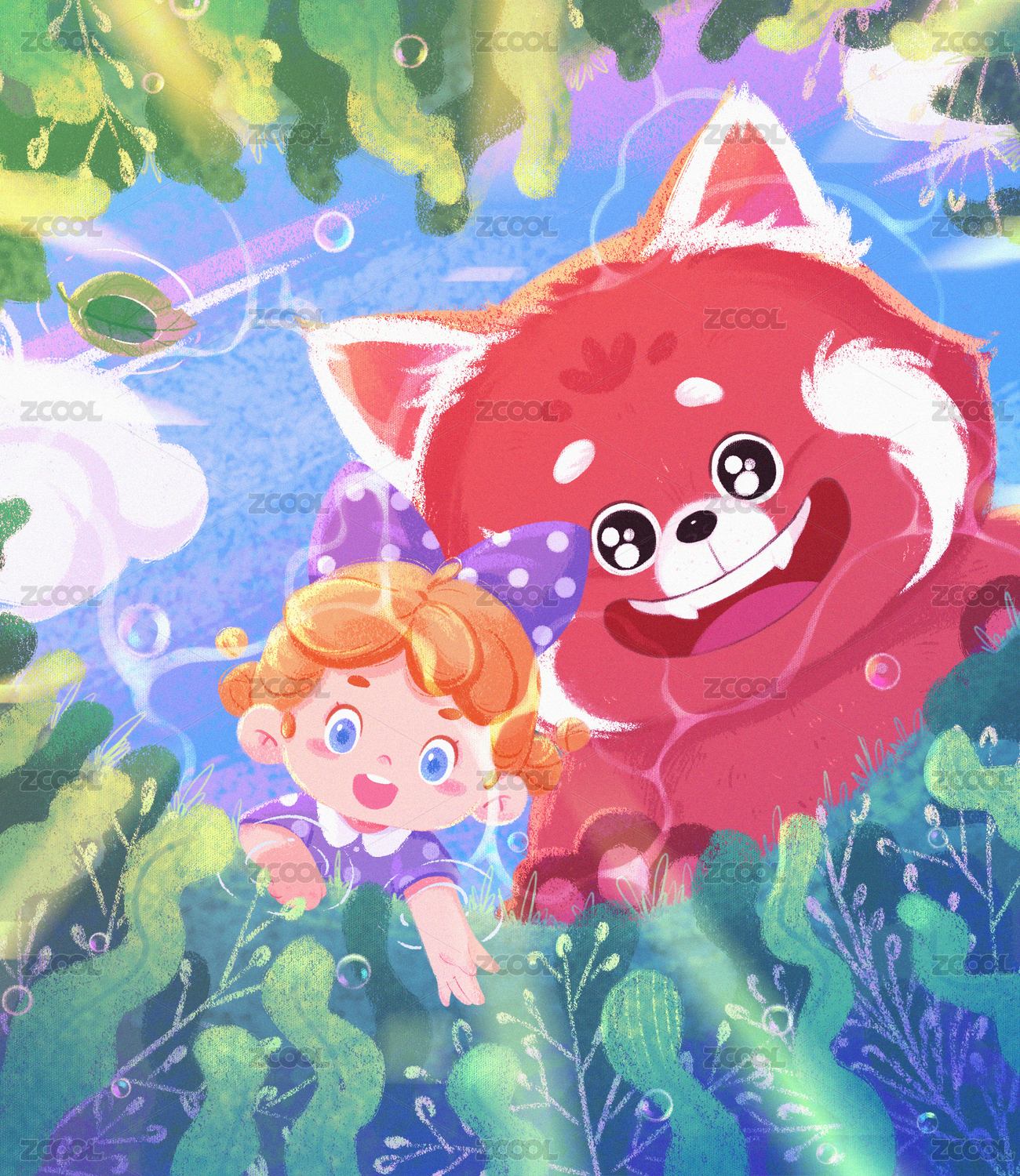 春天在森林中和小松鼠一起吹泡泡的小女孩