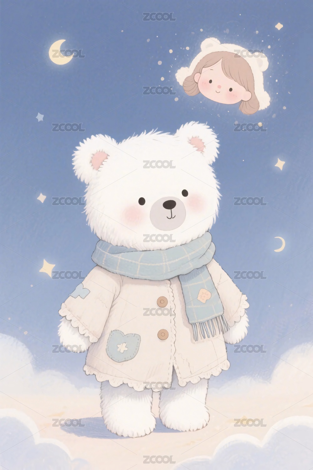 插画女孩和白熊拥抱夜晚温馨手绘场景