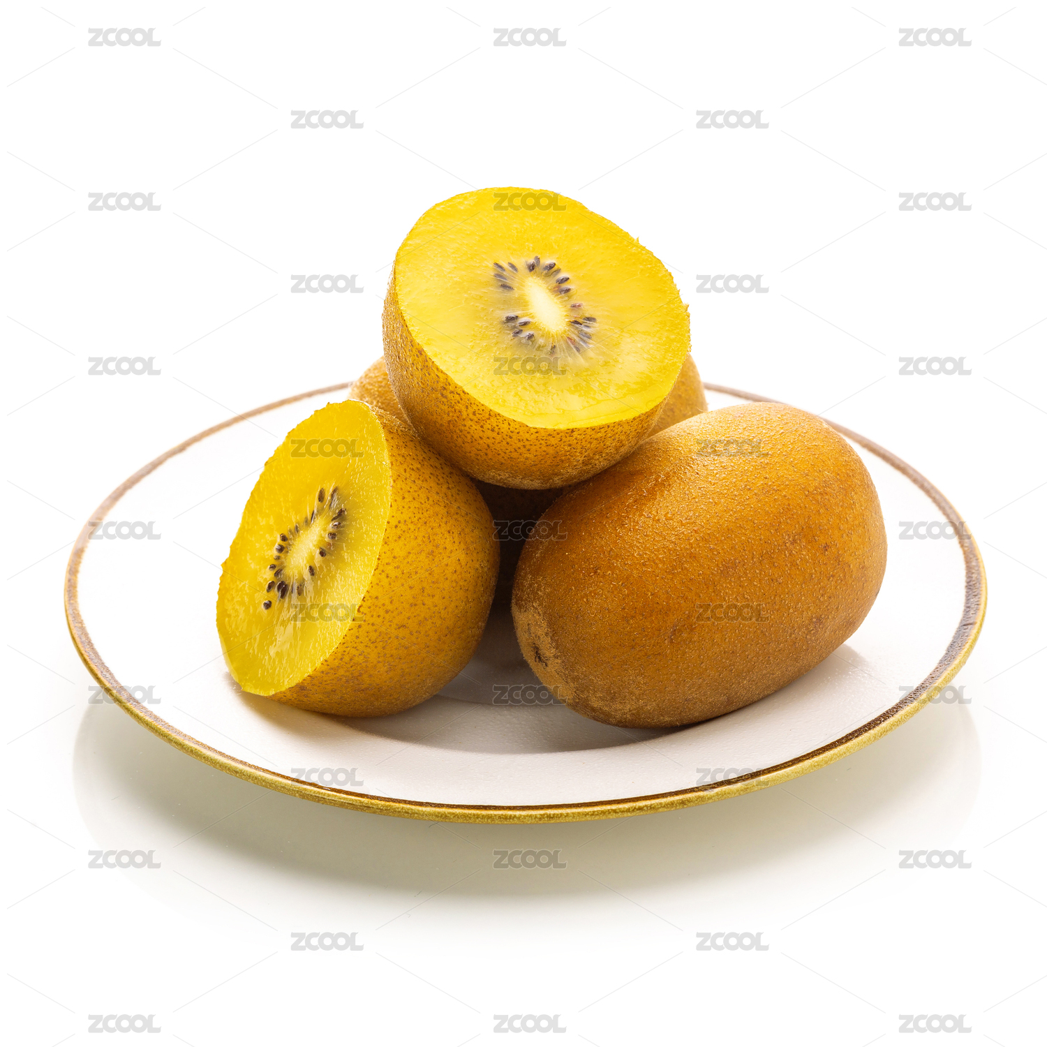 白底上的黄金猕猴桃和切块的黄心猕猴桃