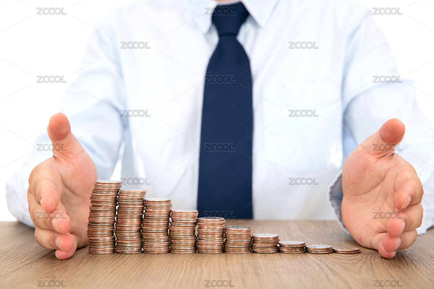 穿着衬衣打着领带双手呵护着一排递减美元硬币的男士