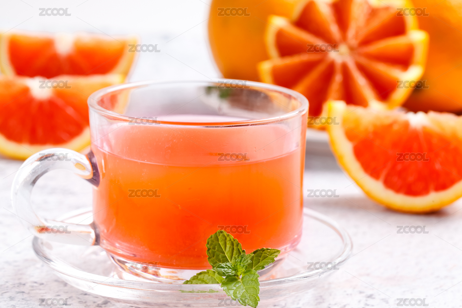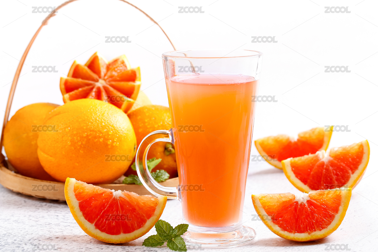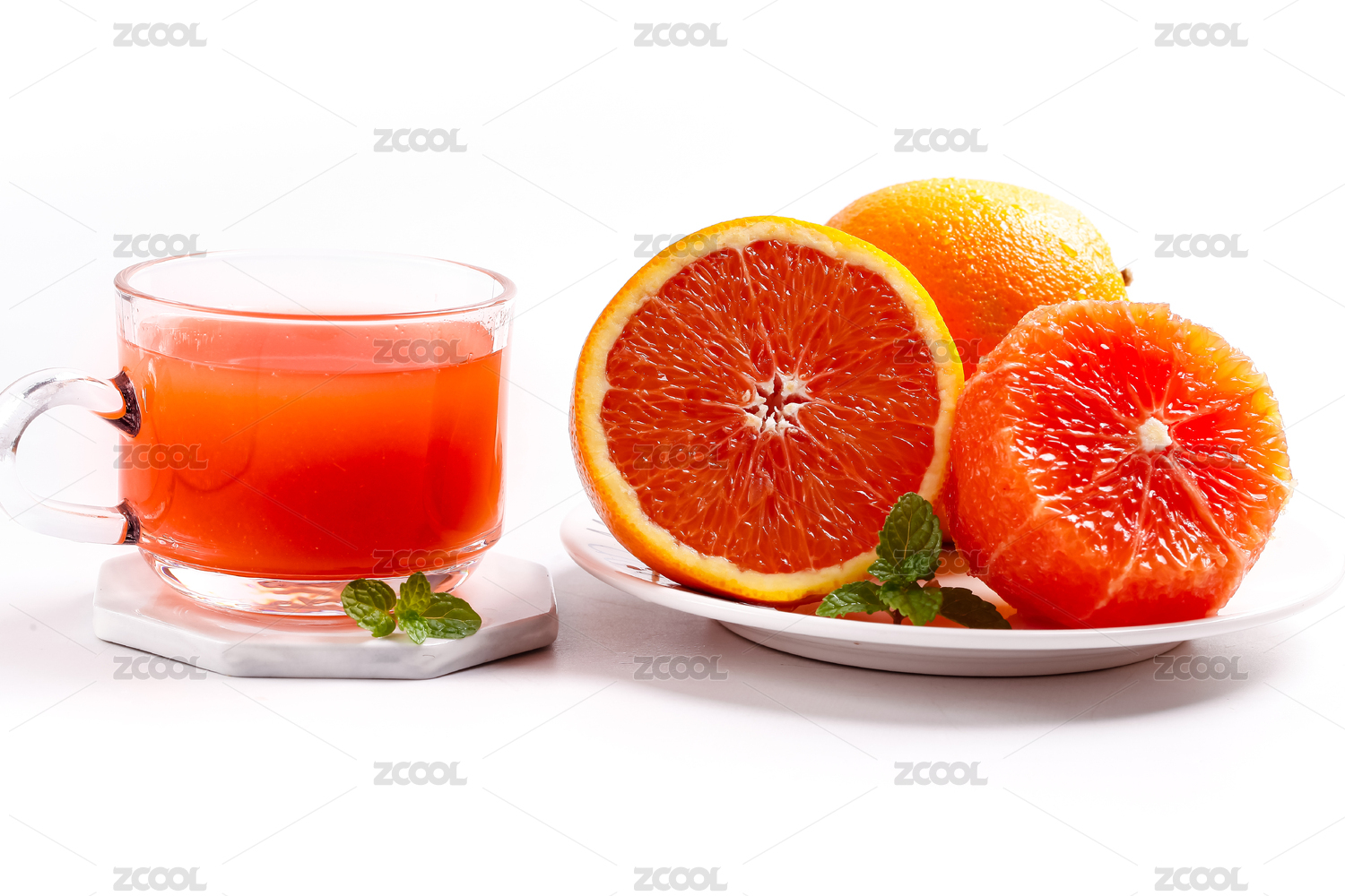 白底上放着一杯橙子汁和血橙