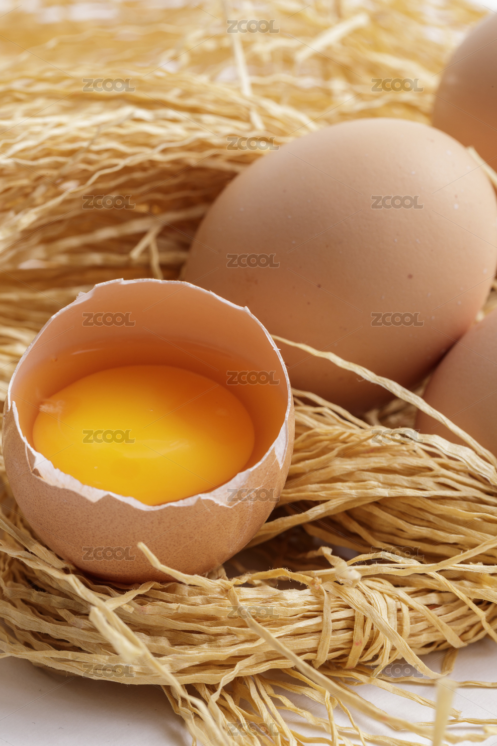 草窝中的几个鸡蛋上放着半个敲开的绿皮鸡蛋