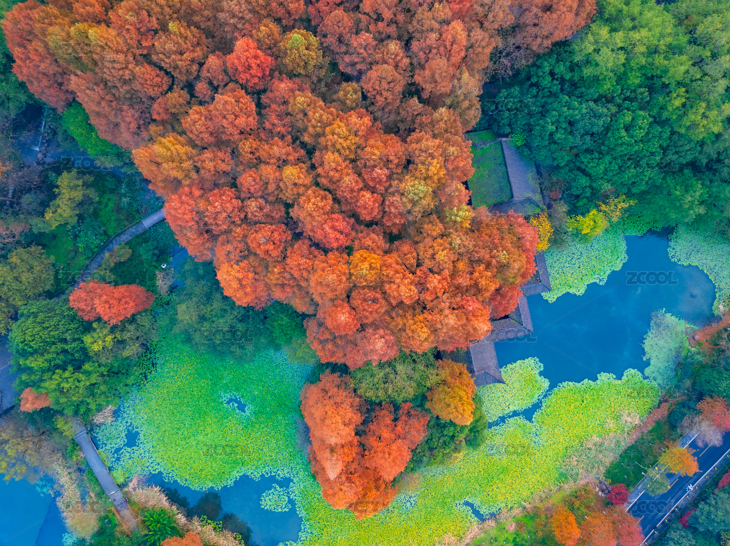 深秋时节 航拍浙江杭州西湖隐秀桥和水杉