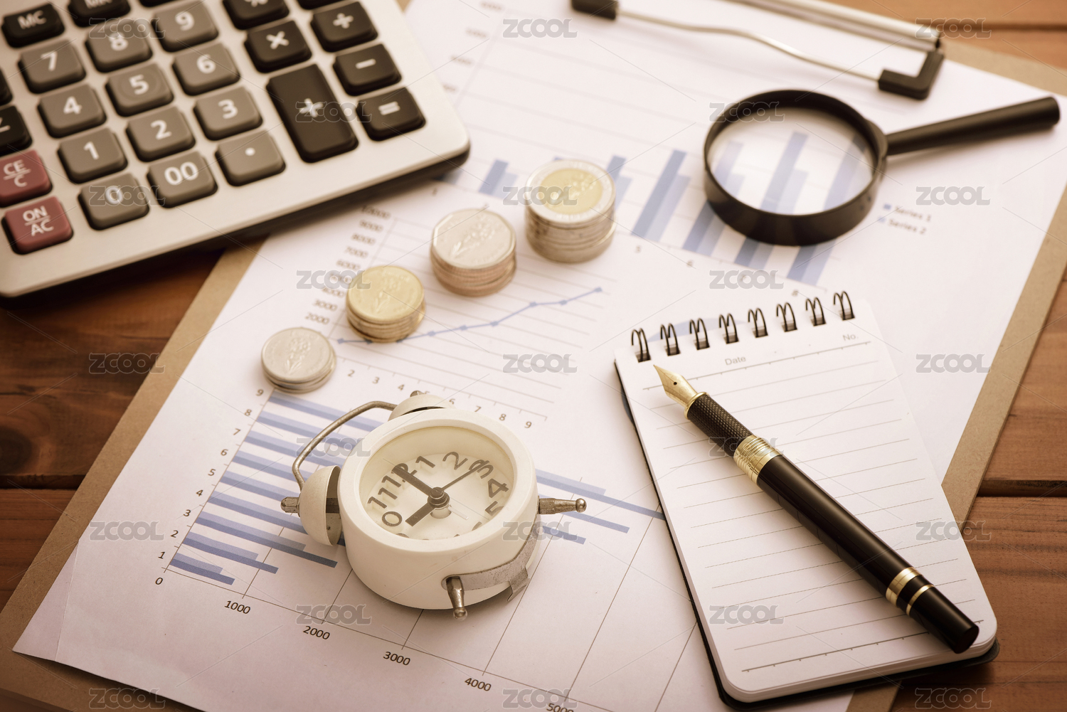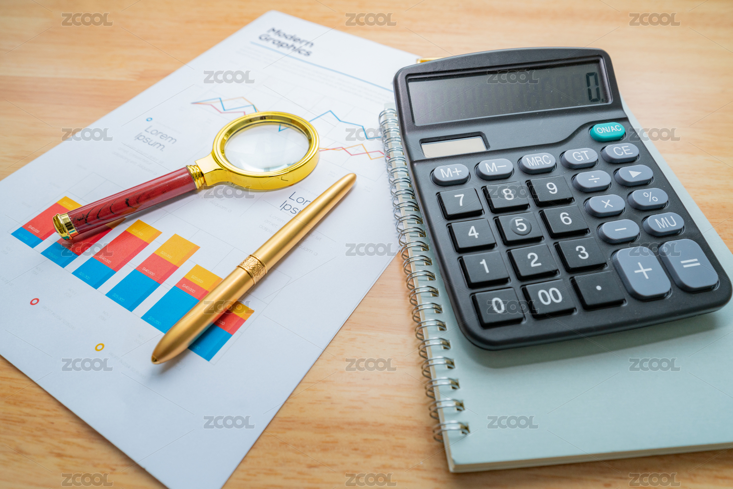金融经济数据增长概念——放在财务数据报表上的计算器、钢笔和放大镜