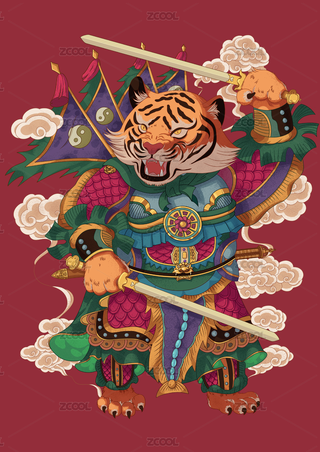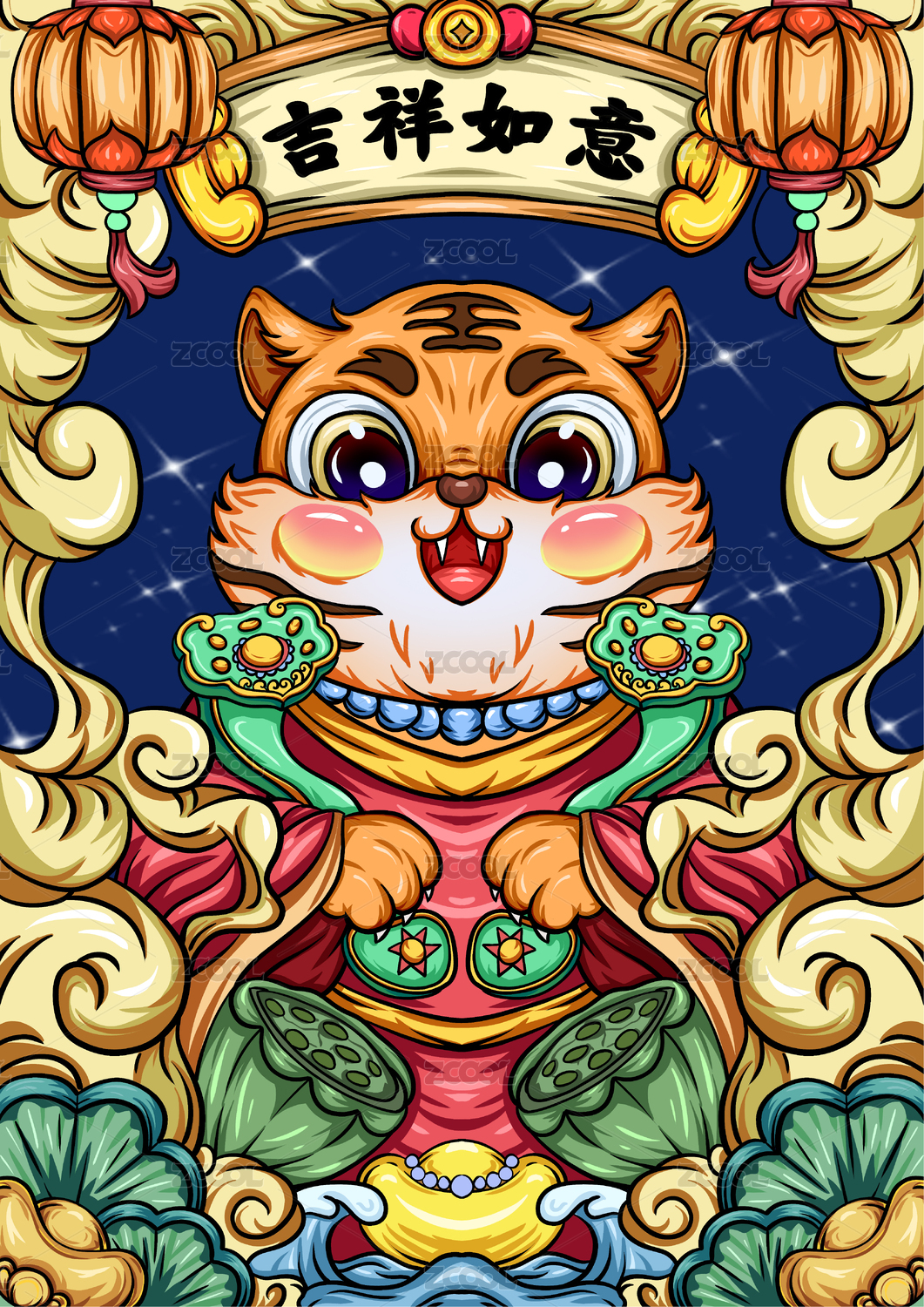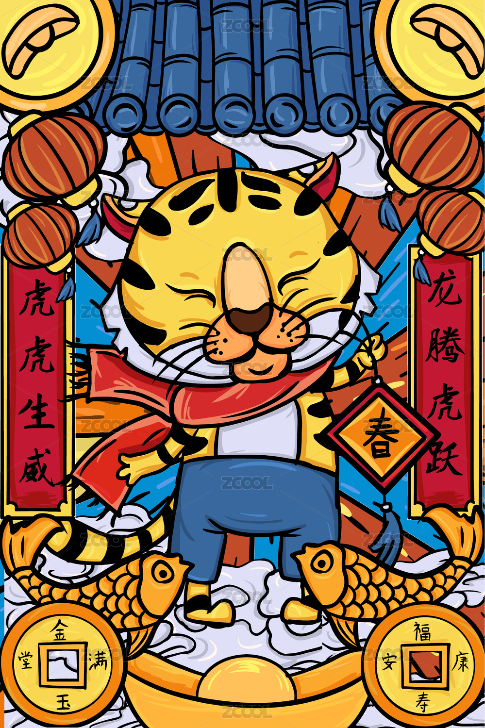 国潮虎年大吉日进斗金老虎财神竖版插画